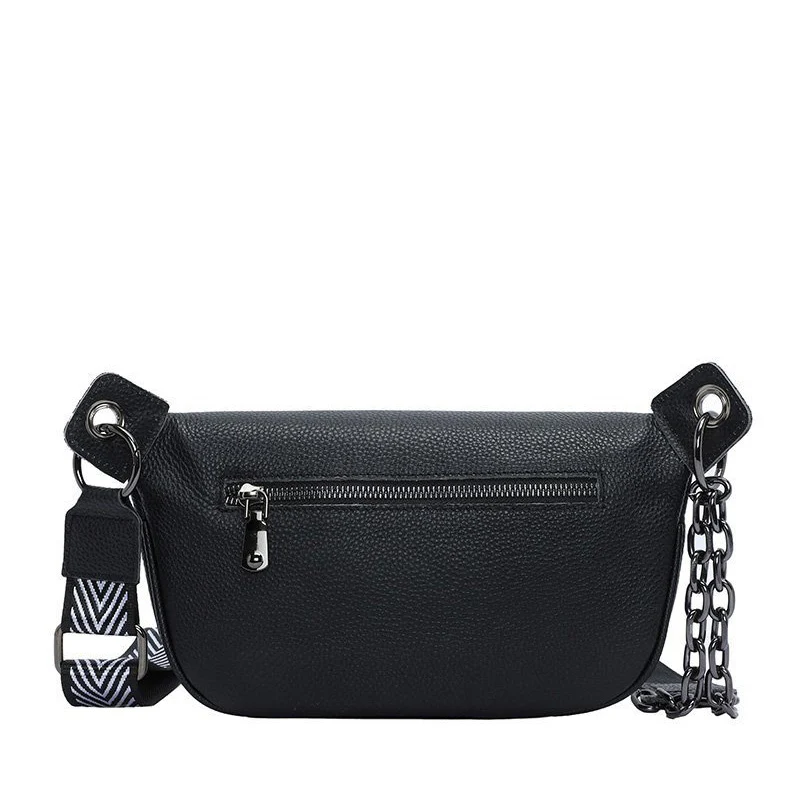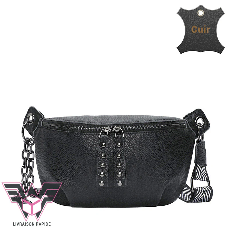 Avec sa bandoulière mixte tissu et chaine ce sac banane femme cuir joue la carte de l’originalité. Ses dimensions généreuses vous permettront d’emporter l’essentiel de vos affaires. Réalisée dans un joli cuir grainé elle sera parfaite avec une tenue citadine.