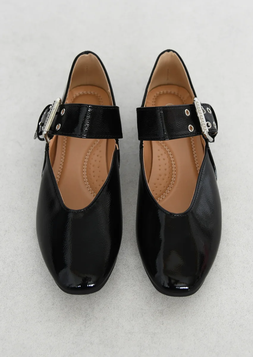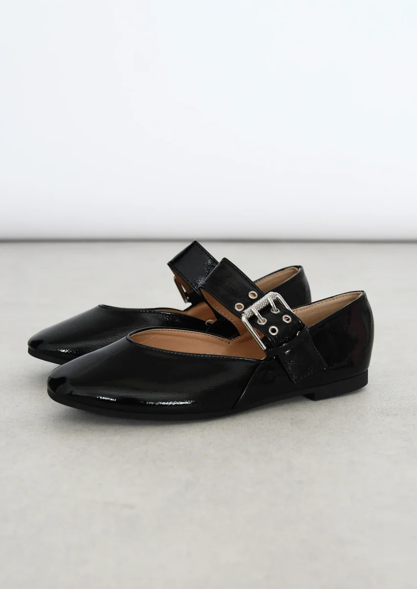 Bride de fermeture à boucle Bout rondSemelle plate Bride réglable Fini verni – DESCRIPTIF PRODUITSimilicuir verni INSTRUCTIONSEssuyer uniquement