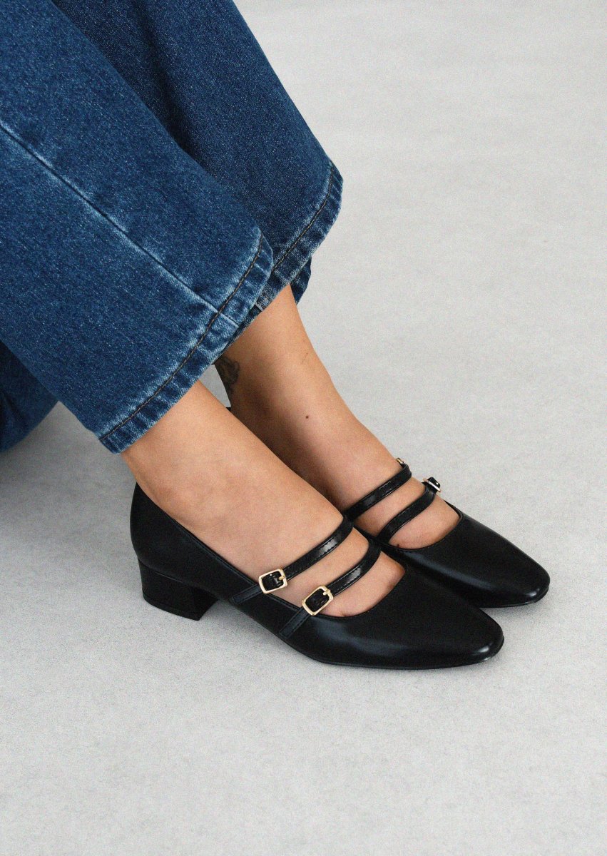 Talon blocDouble brides sur le devantHauteur du talon : 3cmCouleur noir COMPOSITIONSimilicuir INSTRUCTIONSEssuyer uniquement