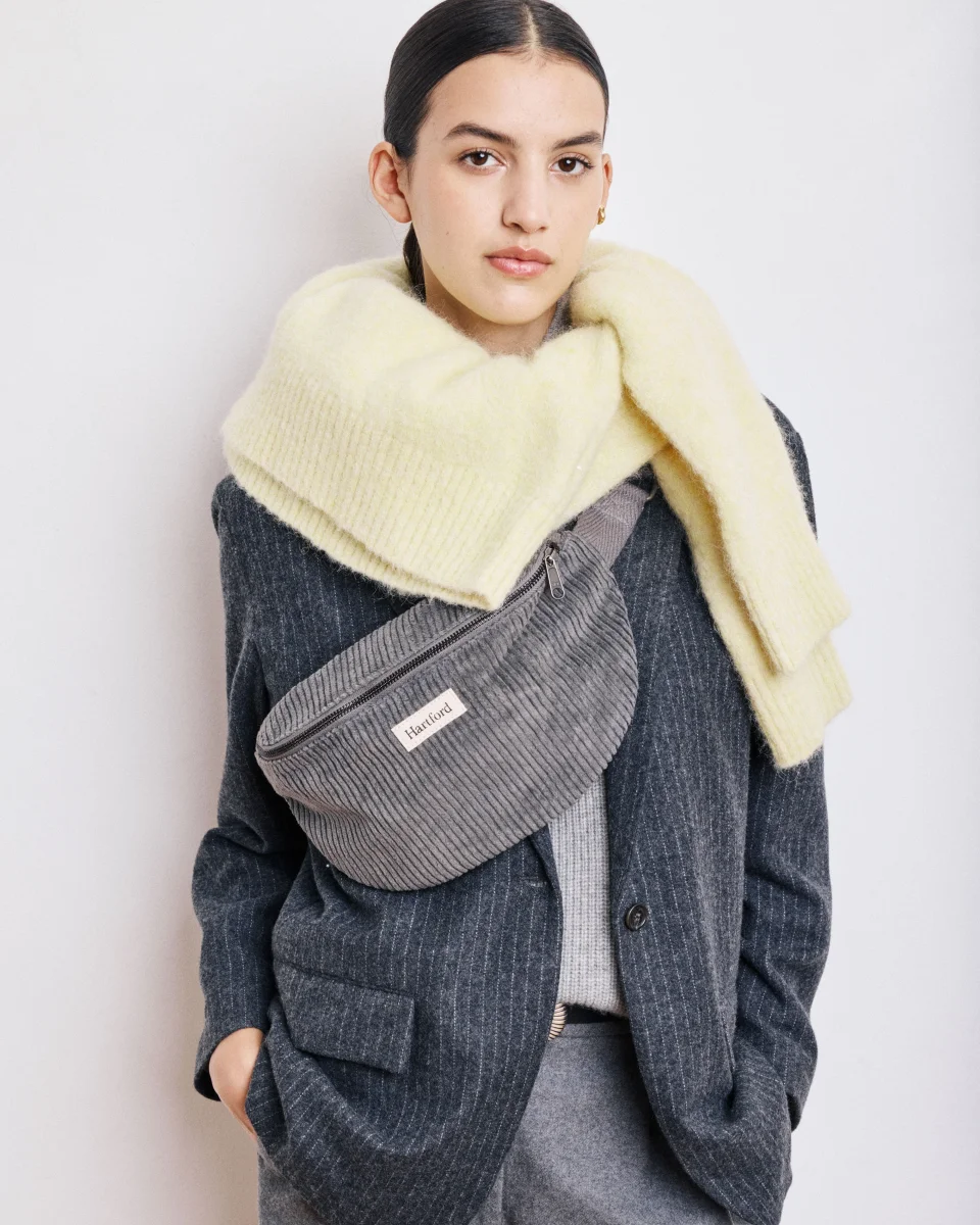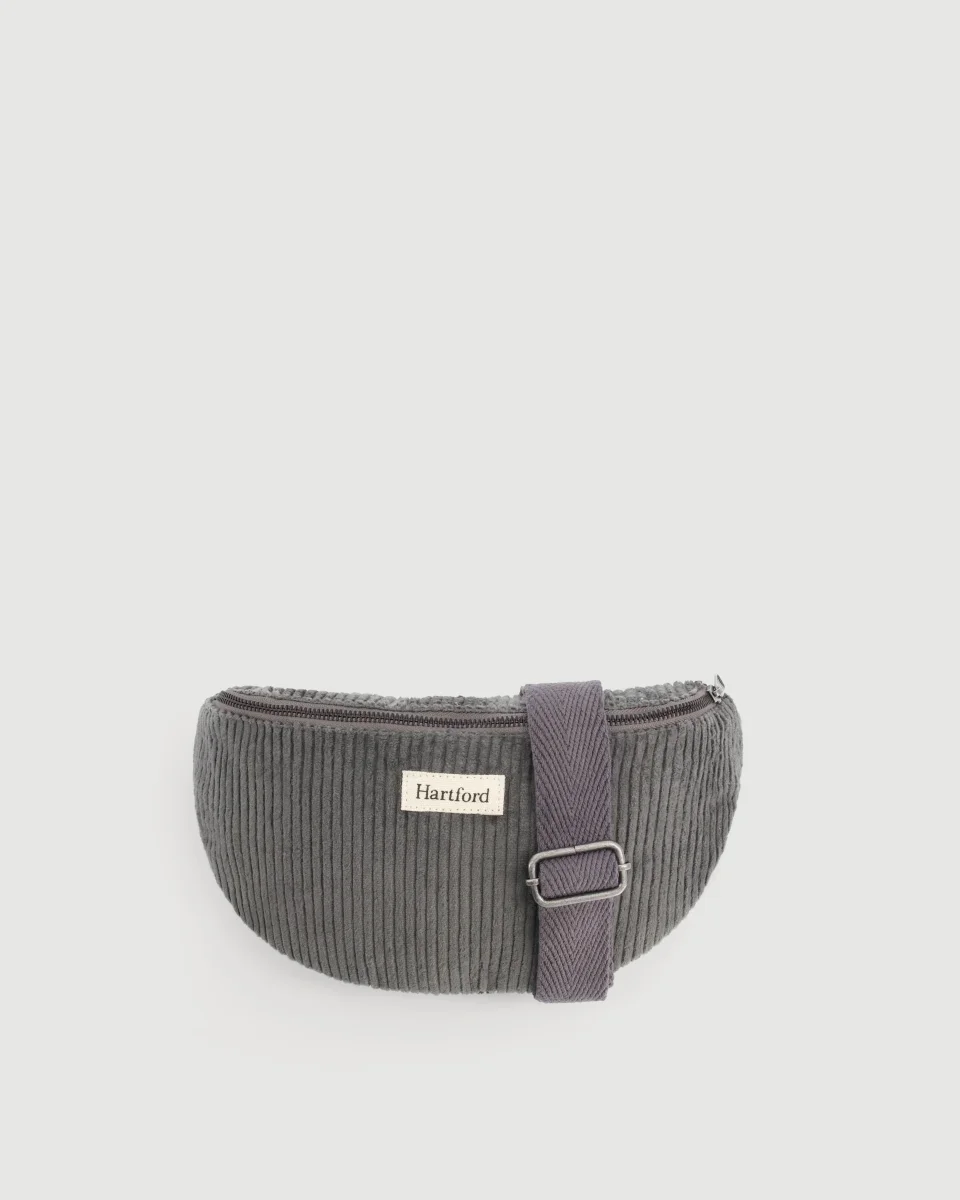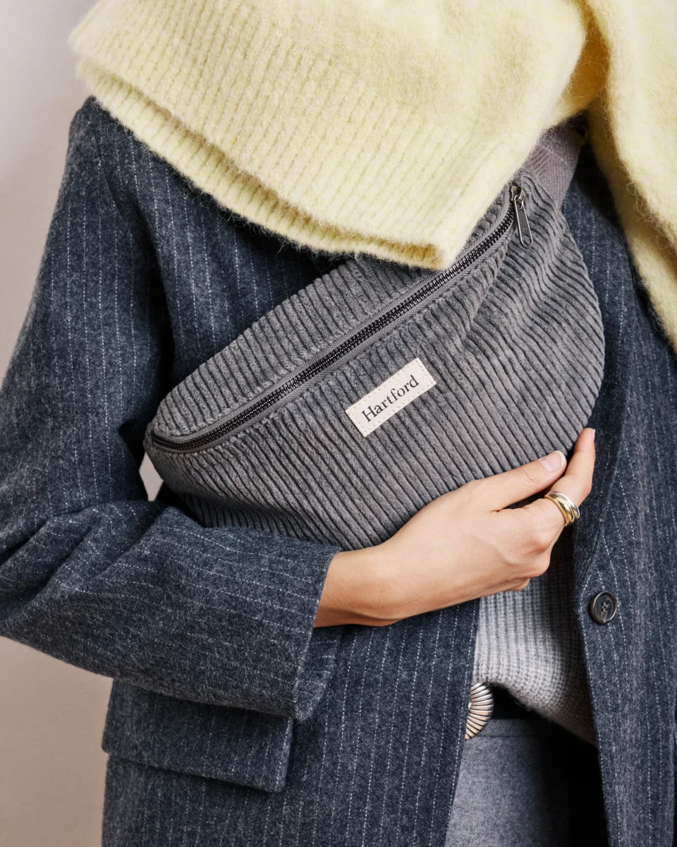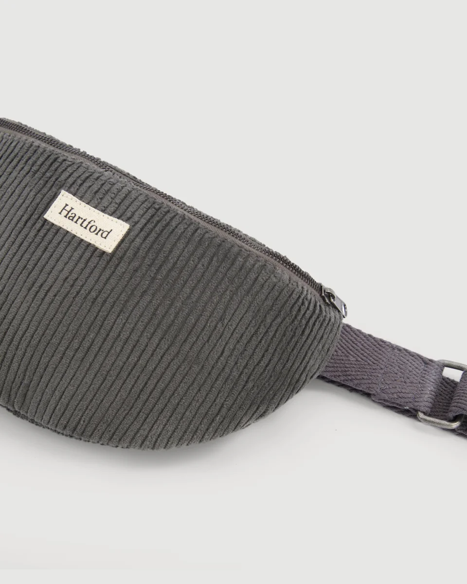 Sac banane en velours côtelé avec étiquette écru Hartford sur le devant. Fermeture par glissière et taille ajustable grâce à une patte de serrage sur la anse.