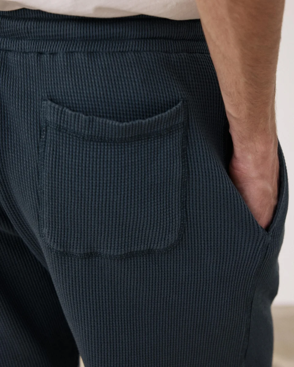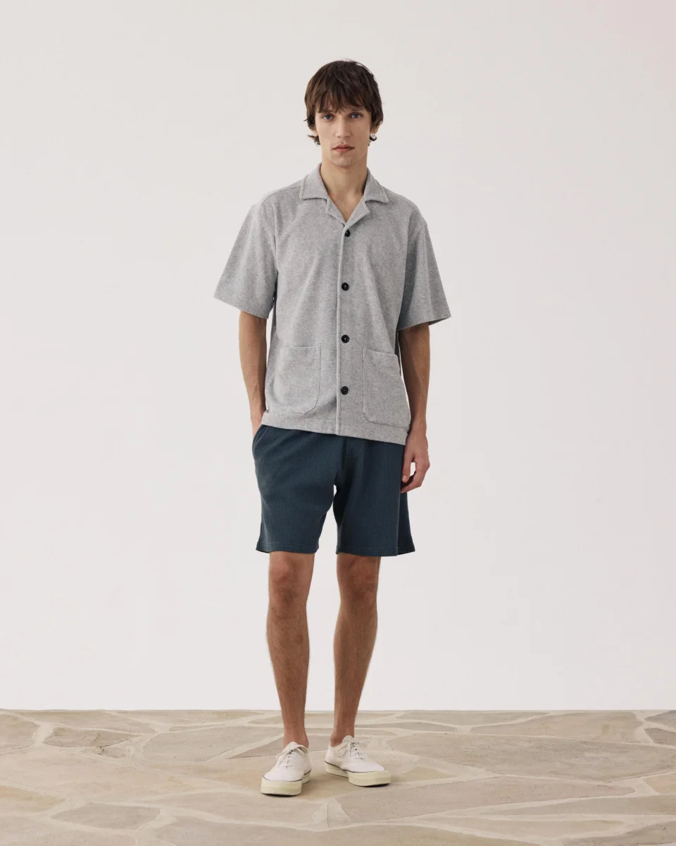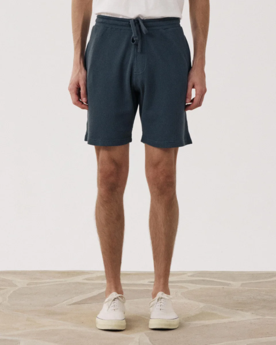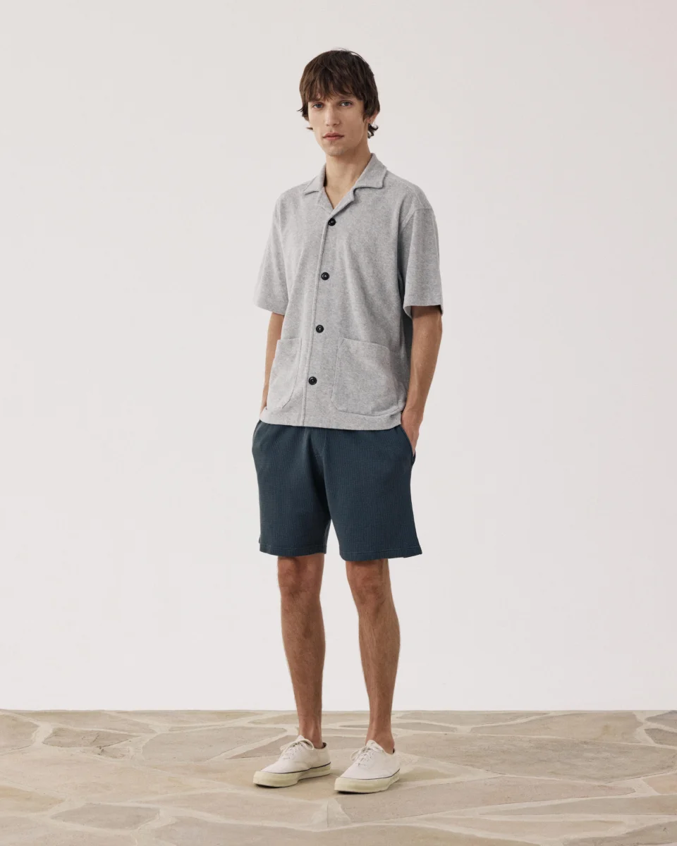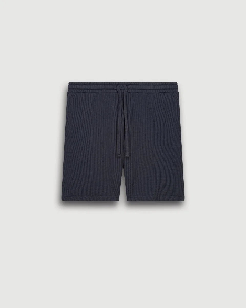 Short bermuda homme réalisé en jersey de coton gaufré « waffle ». Taille élastiquées à cordons. Deux poches latérales. Une poche plaquée dos.