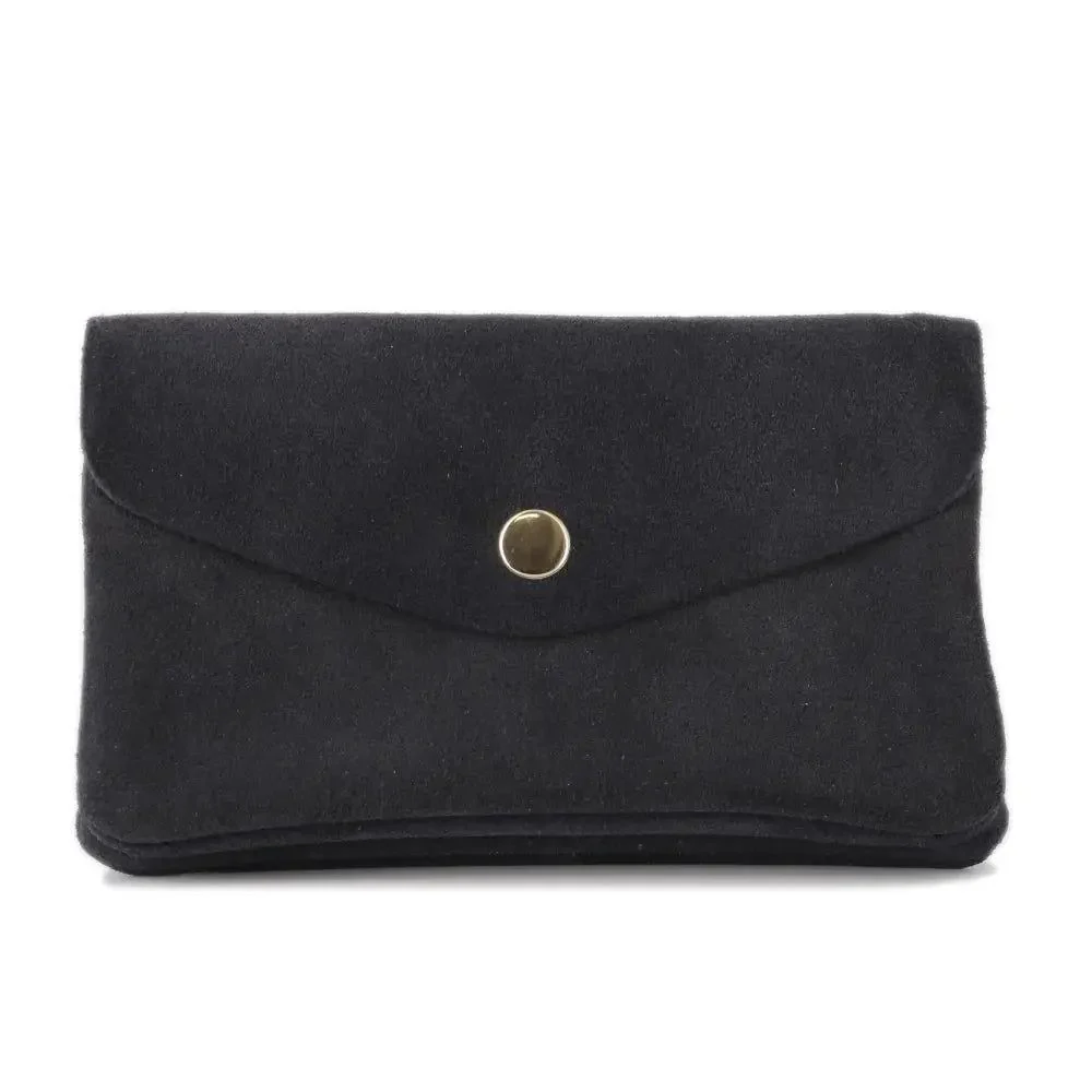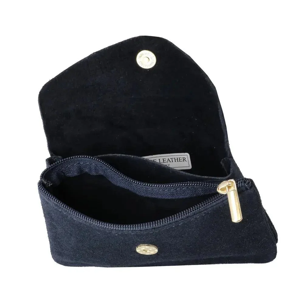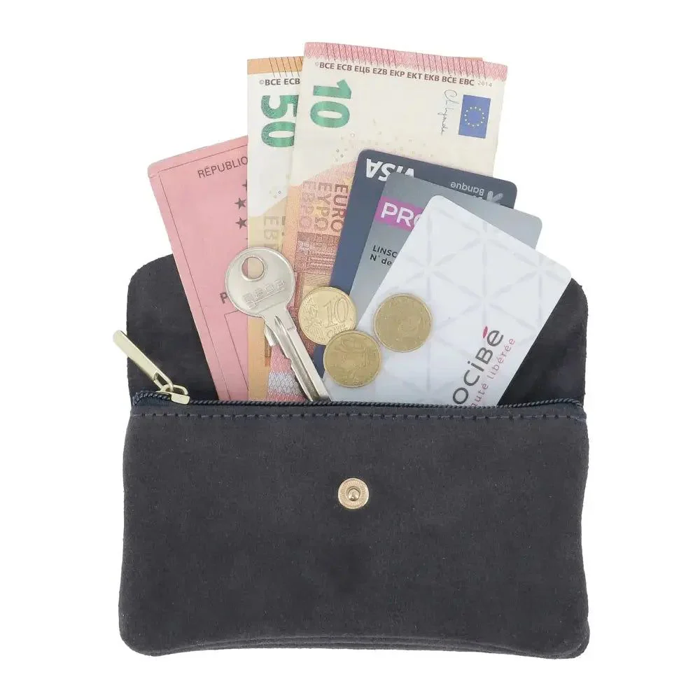 Ce portefeuille pochette tout-en-un allie style et praticité dans un format compact. En cuir suéde véritable, il séduit par son aspect velour, son toucher doux et ses détails métalliques. Doté de deux compartiments principaux et d’une poche centrale, il accueille cartes, pièces, papiers et accessoires essentiels. Sa fermeture à rabat et glissière garantit élégance et sécurité, à emporter seul ou dans votre sac à main.