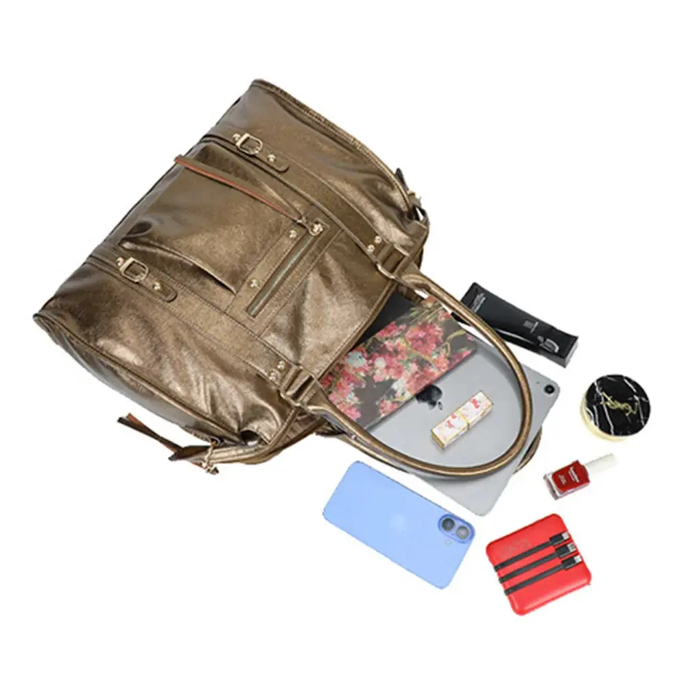 Confectionné en similicuir synthétique souple et résistant, il se porte facilement à la main ou à l’épaule grâce à ses anses rouleaux et sa bandoulière réglable (66 à 120 cm). Son grand format (39 x 30 x 15 cm) permet de ranger dossiers, tablette, portefeuille et autres essentiels avec facilité.
