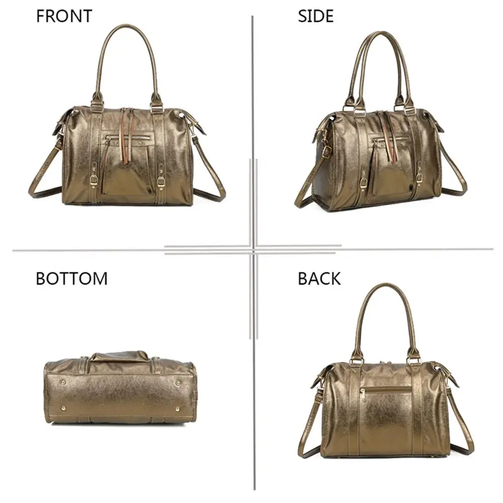 Craquez pour ce sac à main bowling irisé au design structuré et résolument urbain. Son fini légèrement brillant et ses lignes modernes en font un accessoire tendance, parfait pour sublimer vos tenues du quotidien. Orné de lanières décoratives, de rivets discrets et d’une poche zippée à l’avant, ce sac combine élégance et praticité.