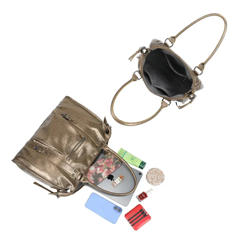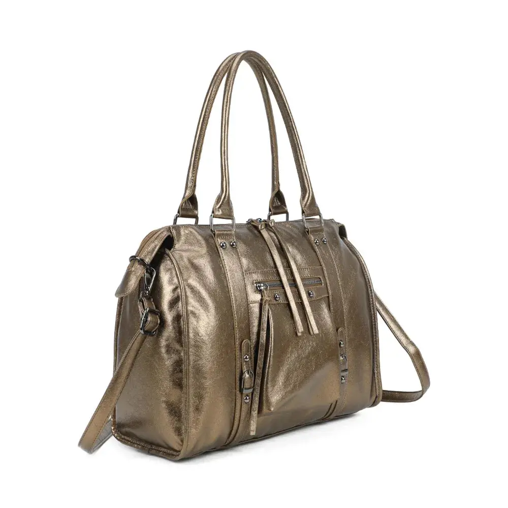 Craquez pour ce sac à main bowling irisé au design structuré et résolument urbain. Son fini légèrement brillant et ses lignes modernes en font un accessoire tendance, parfait pour sublimer vos tenues du quotidien. Orné de lanières décoratives, de rivets discrets et d’une poche zippée à l’avant, ce sac combine élégance et praticité.