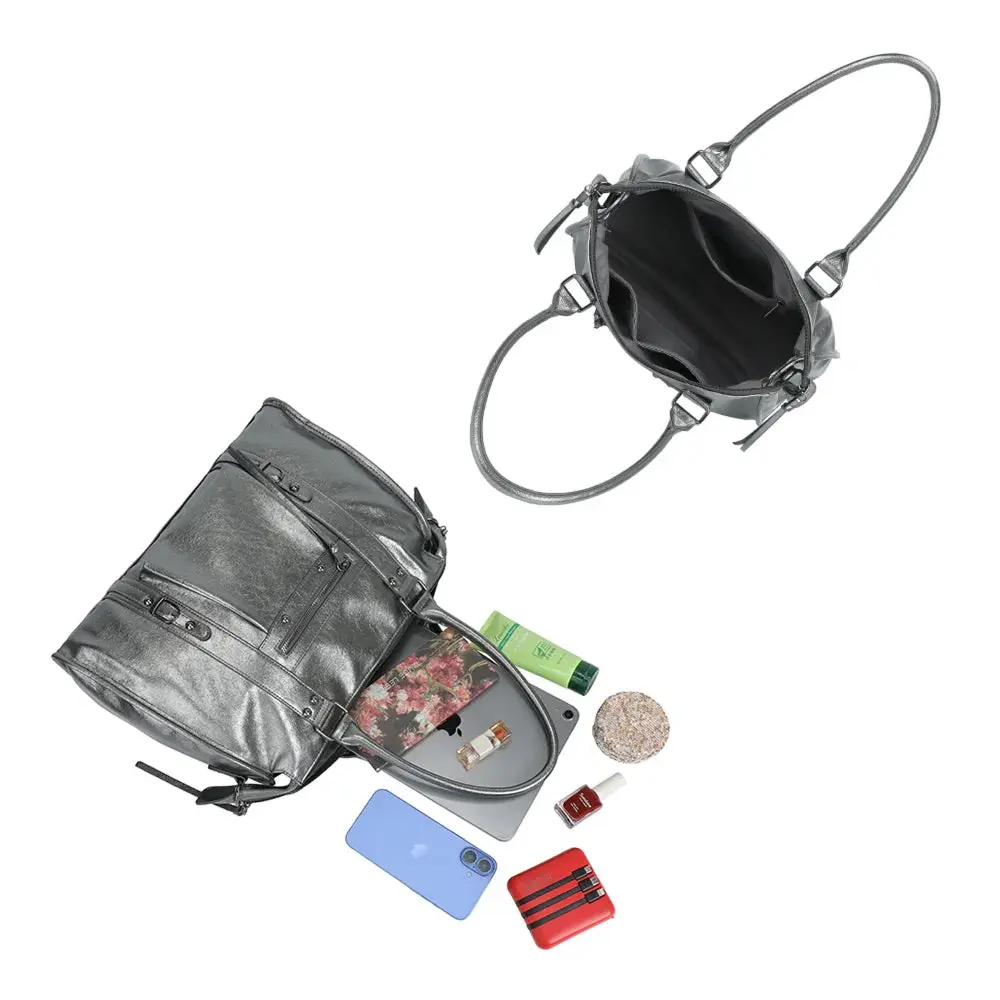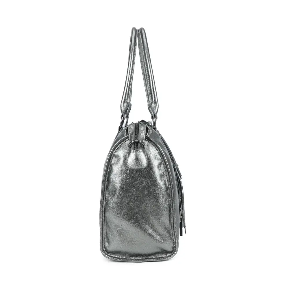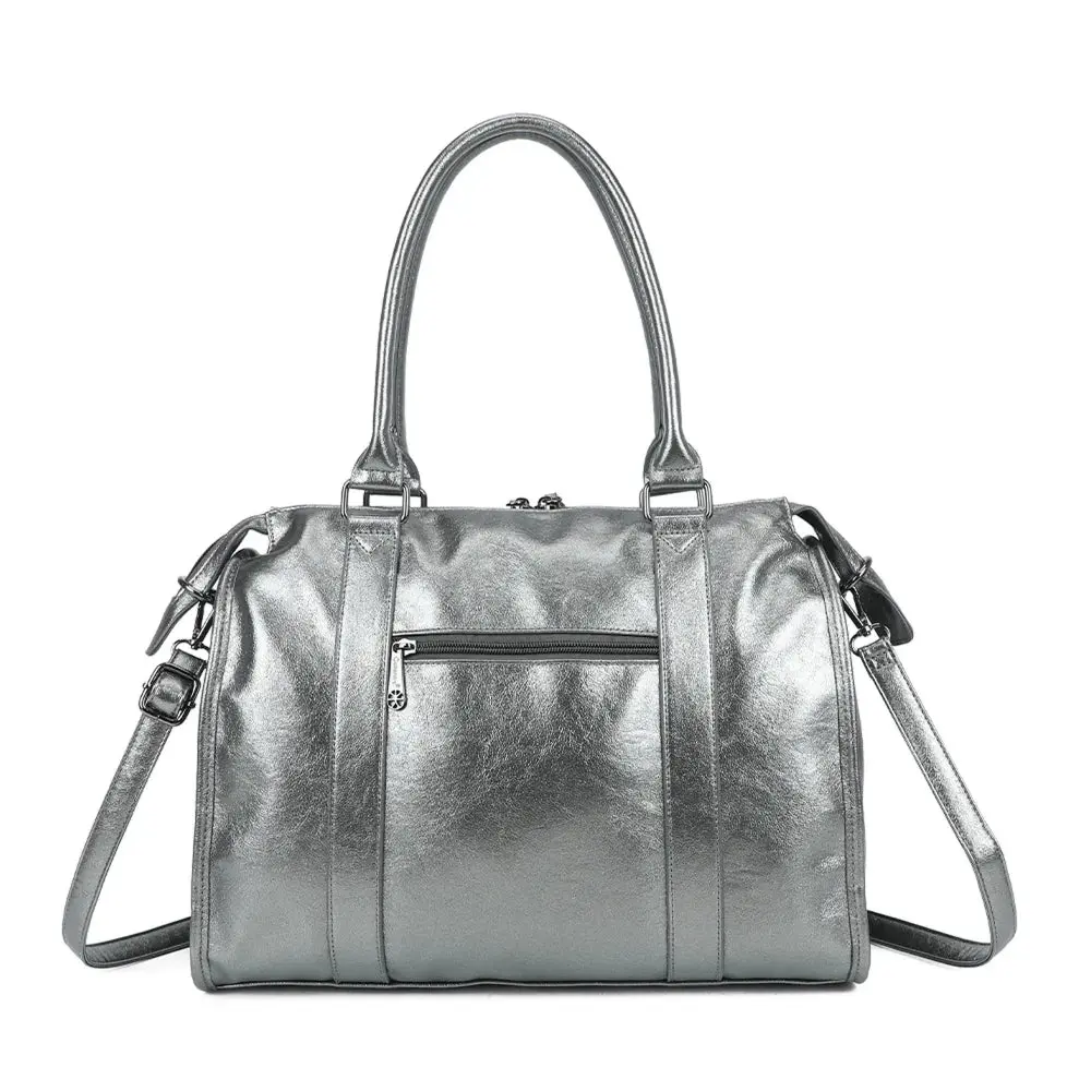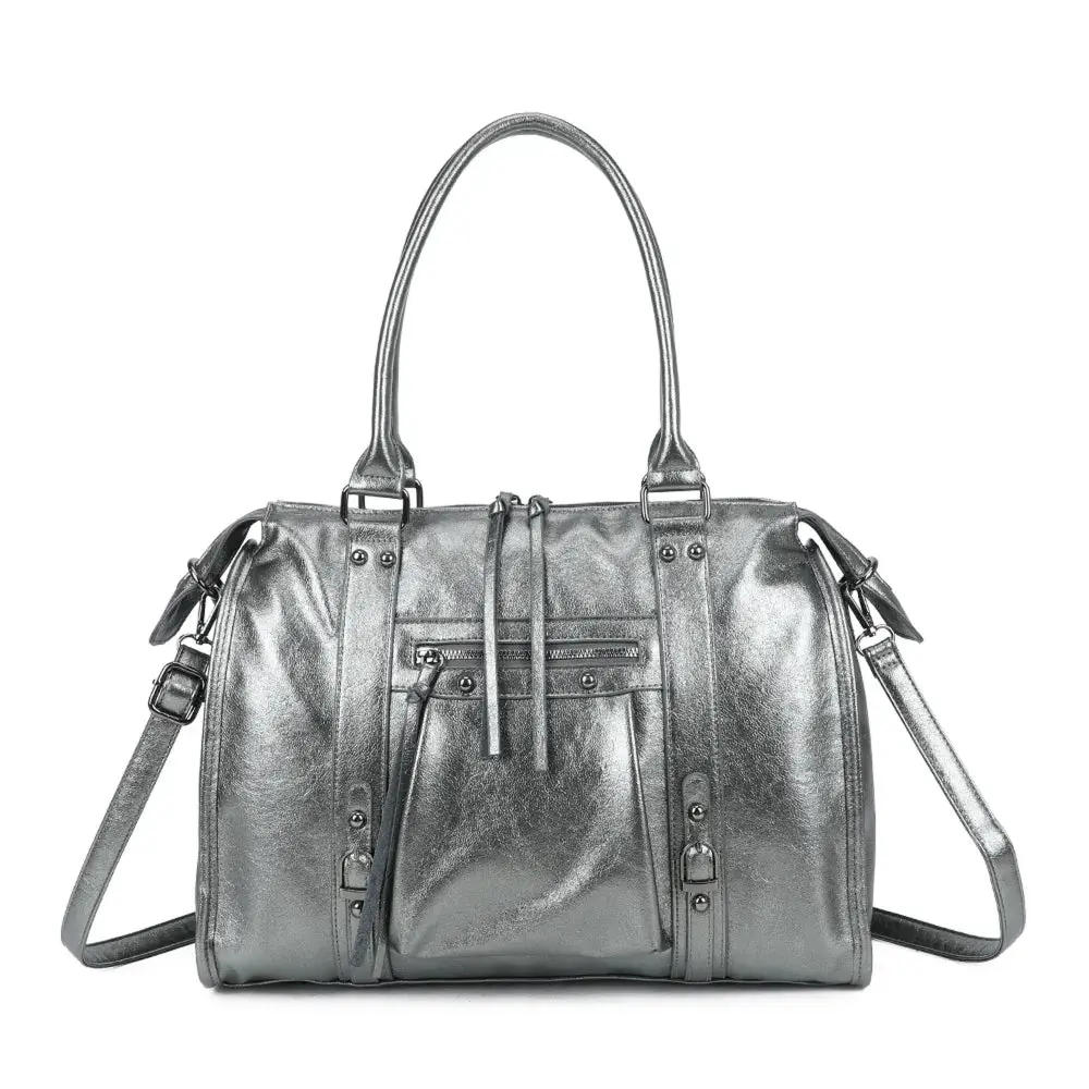 Craquez pour ce sac à main bowling irisé au design structuré et résolument urbain. Son fini légèrement brillant et ses lignes modernes en font un accessoire tendance, parfait pour sublimer vos tenues du quotidien. Orné de lanières décoratives, de rivets discrets et d’une poche zippée à l’avant, ce sac combine élégance et praticité.