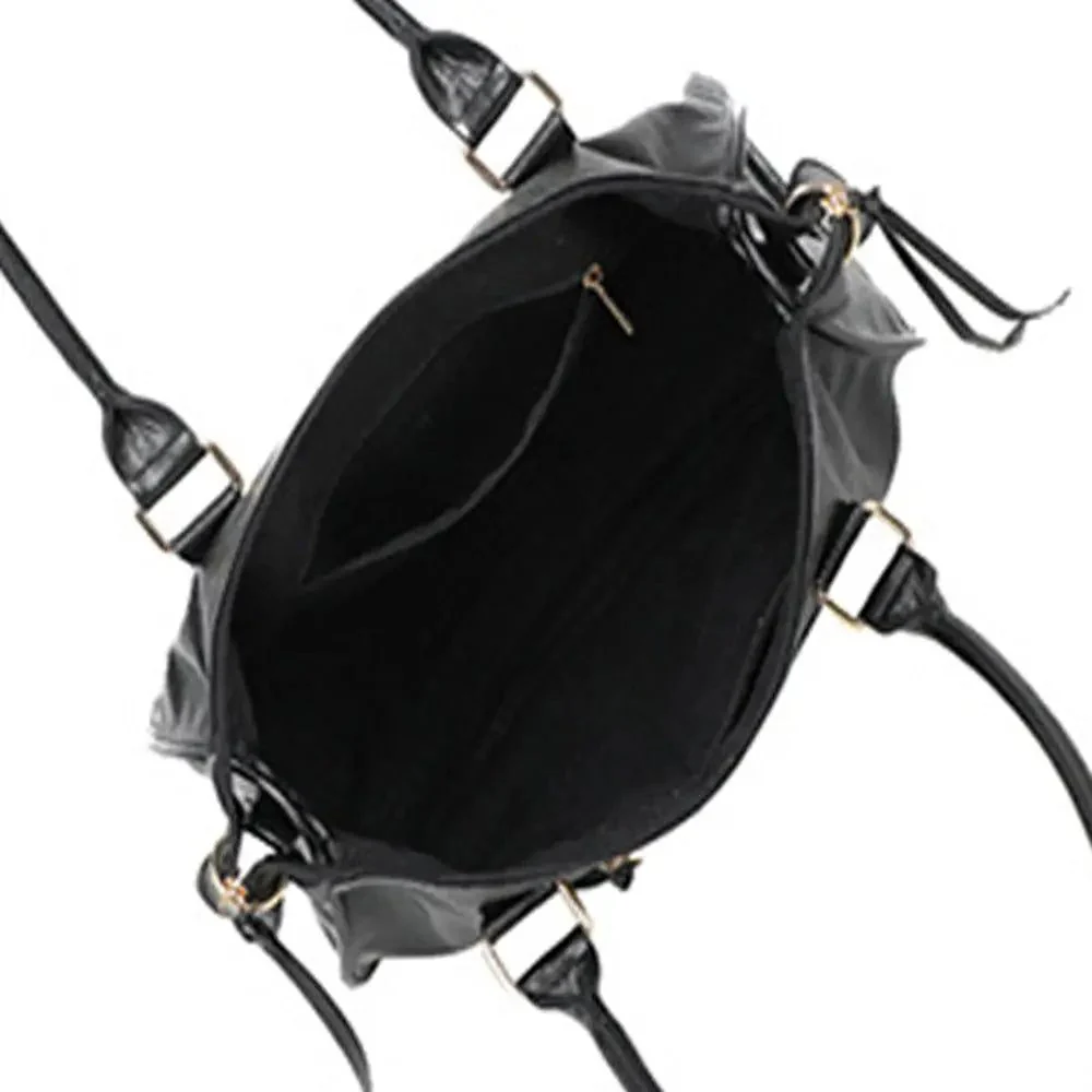 Craquez pour ce sac à main bowling irisé au design structuré et résolument urbain. Son fini légèrement brillant et ses lignes modernes en font un accessoire tendance, parfait pour sublimer vos tenues du quotidien. Orné de lanières décoratives, de rivets discrets et d’une poche zippée à l’avant, ce sac combine élégance et praticité.