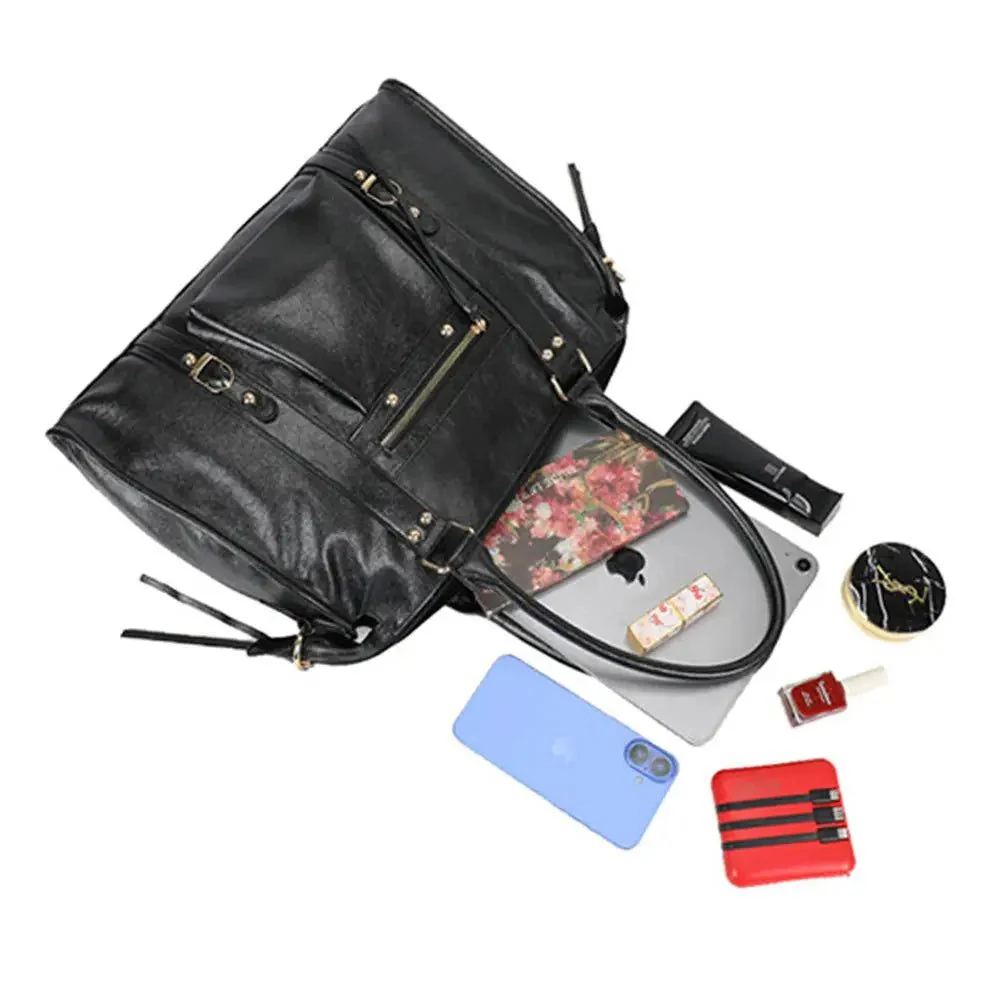Confectionné en similicuir synthétique souple et résistant, il se porte facilement à la main ou à l’épaule grâce à ses anses rouleaux et sa bandoulière réglable (66 à 120 cm). Son grand format (39 x 30 x 15 cm) permet de ranger dossiers, tablette, portefeuille et autres essentiels avec facilité.
