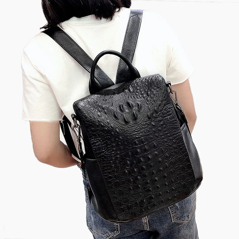 Finition imitation crocodile pour ce sac aussi beau que pratique. Ne laissez pas vos affaires à la merci des voleurs et pickpockets Grâce à sa poche arrière sécurisée ce sac à dos antivol femme vous assurera la tranquillité dans les transports et les endroits très fréquentés.