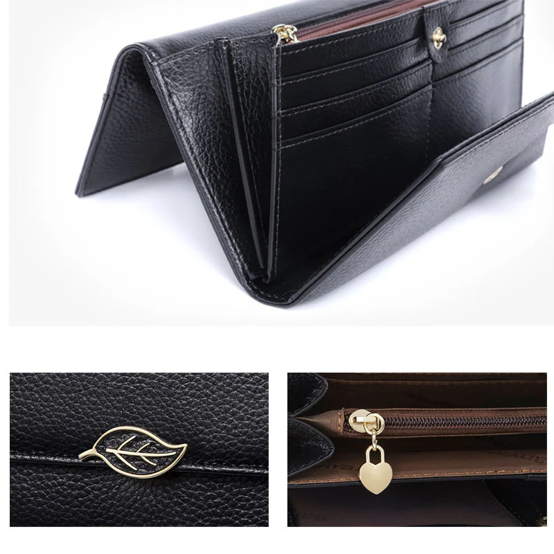 Tout le plaisir d’un portefeuille en cuir femme au design élégant et aux détails soignés. Son fermoir de type morillon en forme de feuille lui donne cette touche originale finale. Ce portefeuille femme est aussi très pratique grâce à son agencement intérieur bien pensé.