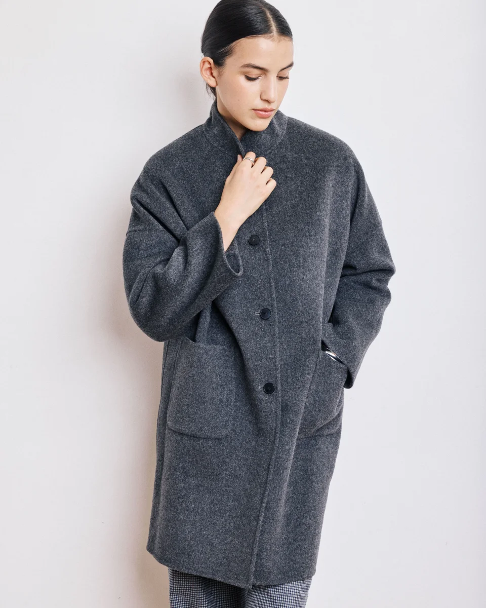 Manteau femme ample, mi-long d’inspiration cape avec boutonnage à quatre boutons en laine double face. Col montant et emmanchures tombantes. Deux poches plaquées sur le devant.