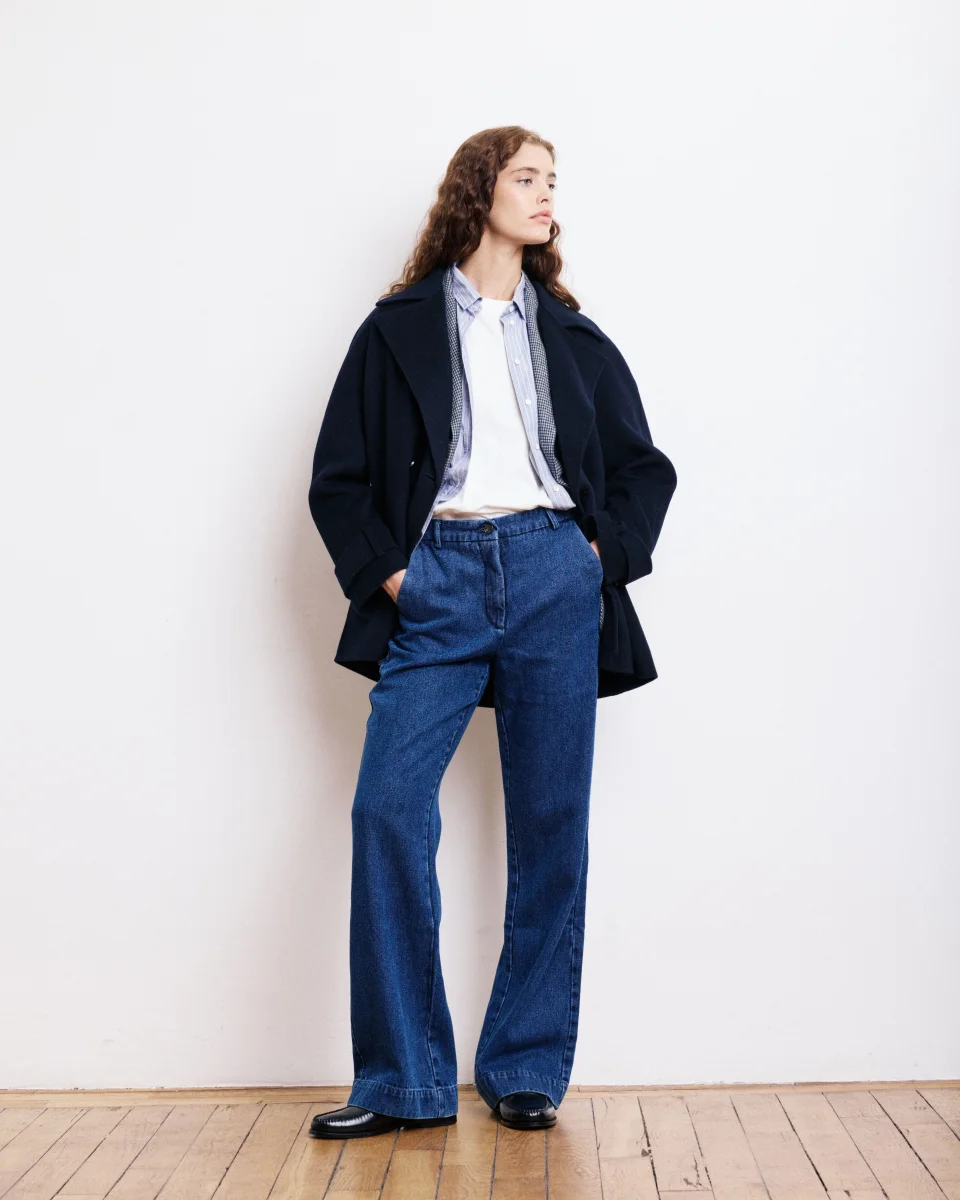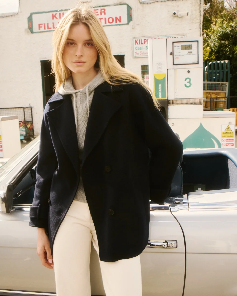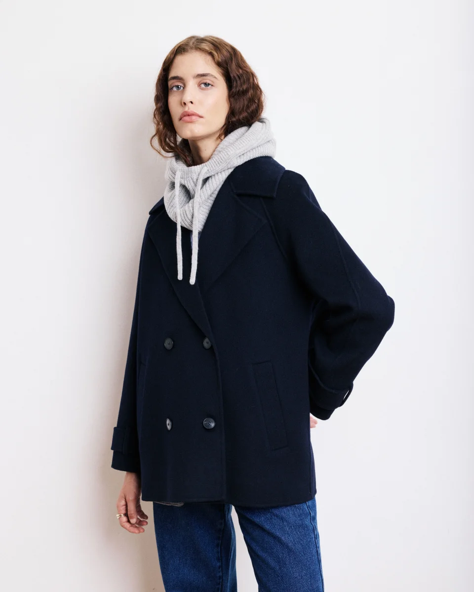 Manteau femme esprit caban en laine double face. Emmanchures raglan avec double boutonnage. Patte de resserrage aux manches et deux poches biais.
