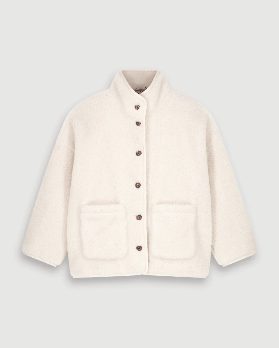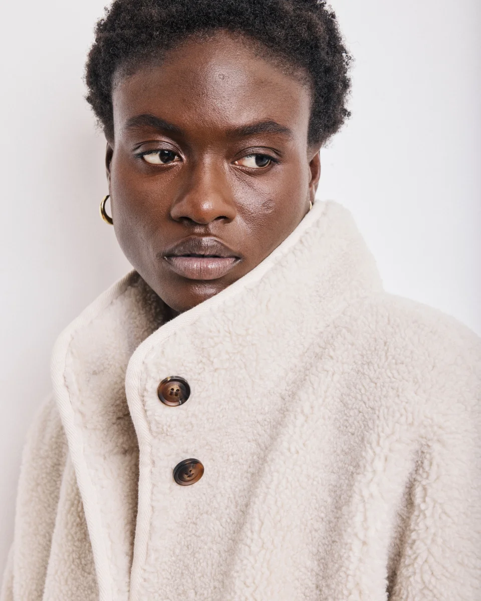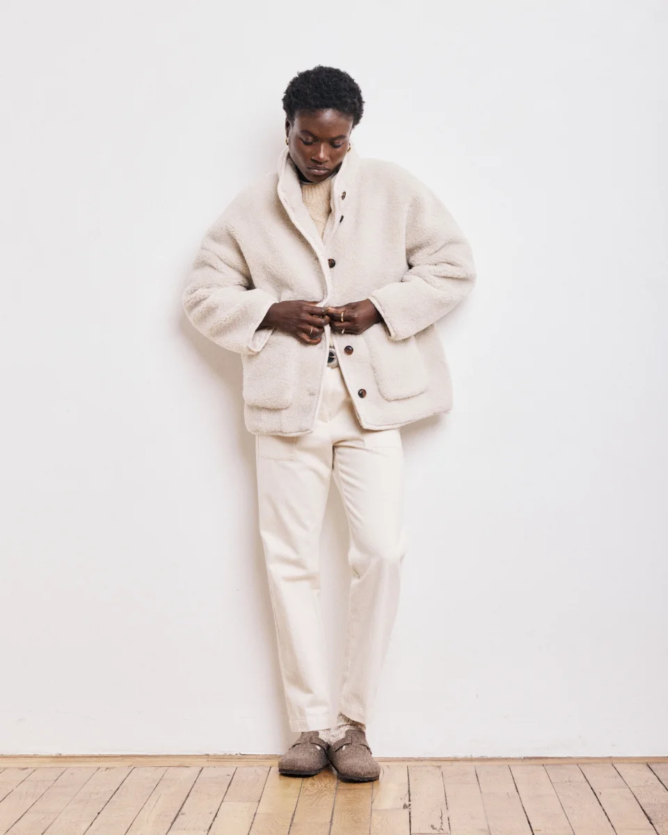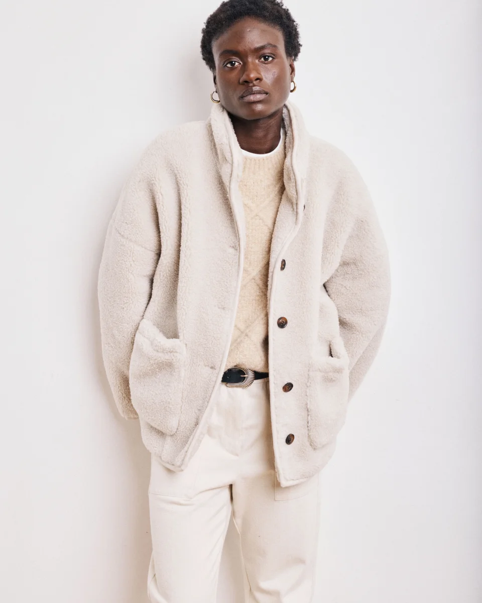 Manteau femme ample à col montant en fausse fourrure bouclée. Emmanchures tombantes et deux poches plaquées devant. Doublure imprimé exclusif léopard. Finitions biais.
