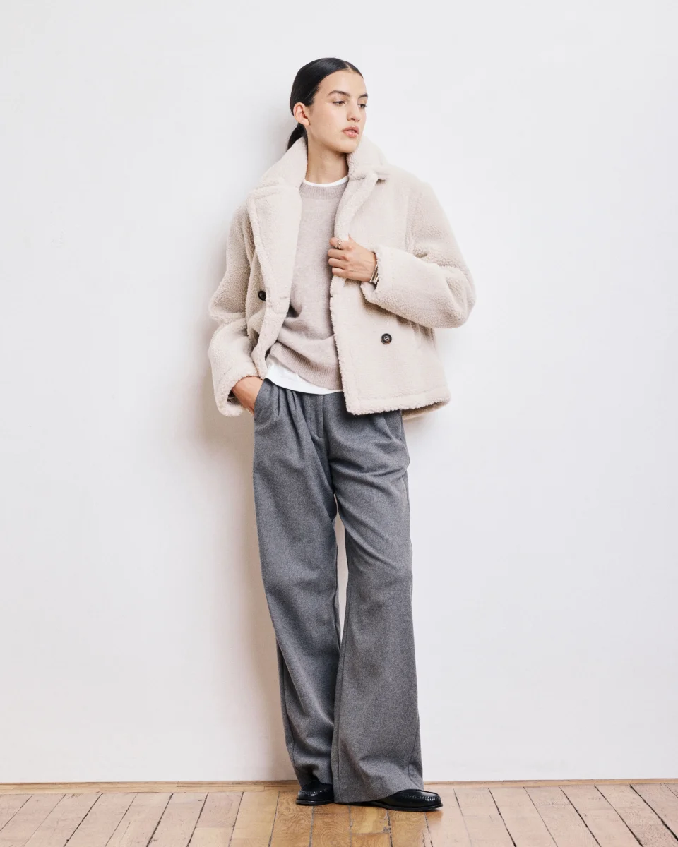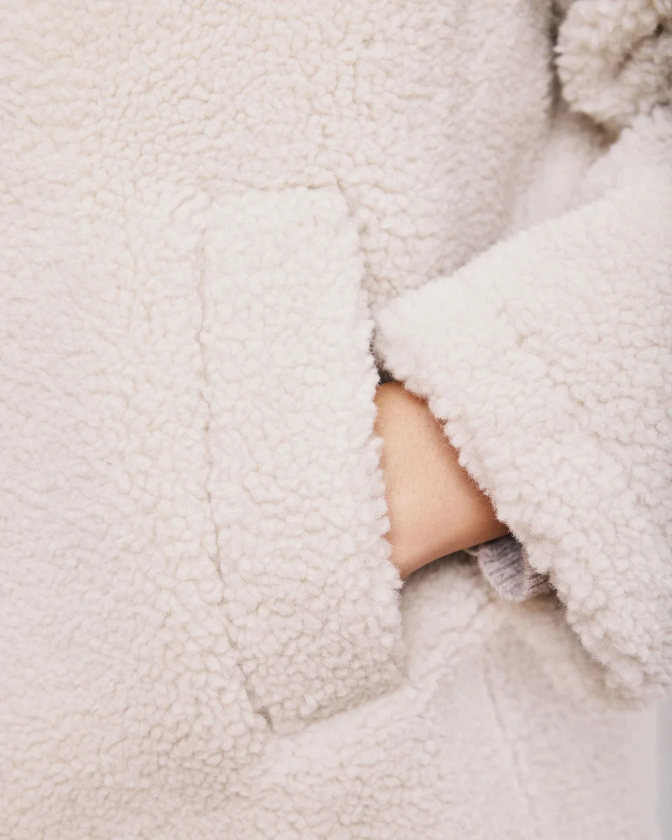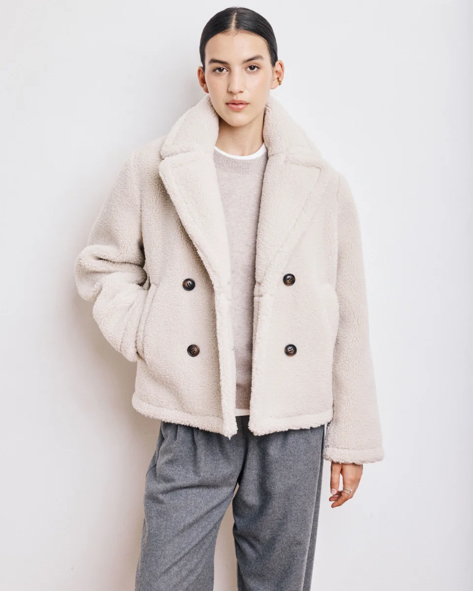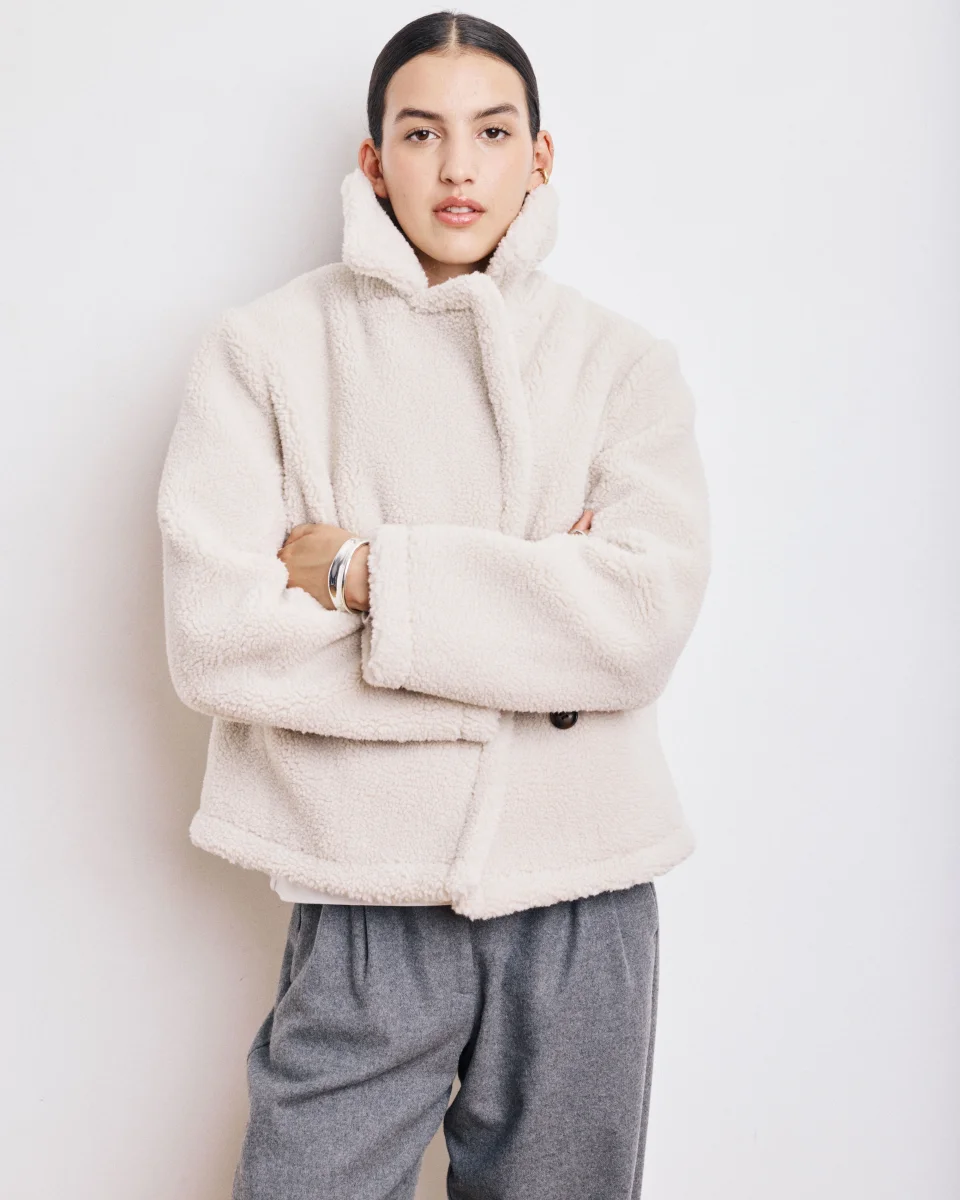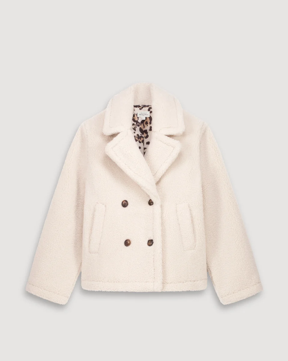 Manteau femme court esprit caban en sherpa. Emmanchures légèrement tombantes et deux poches biais latérales. Double patte de boutonnage et doublure imprimé exclusif léopard.