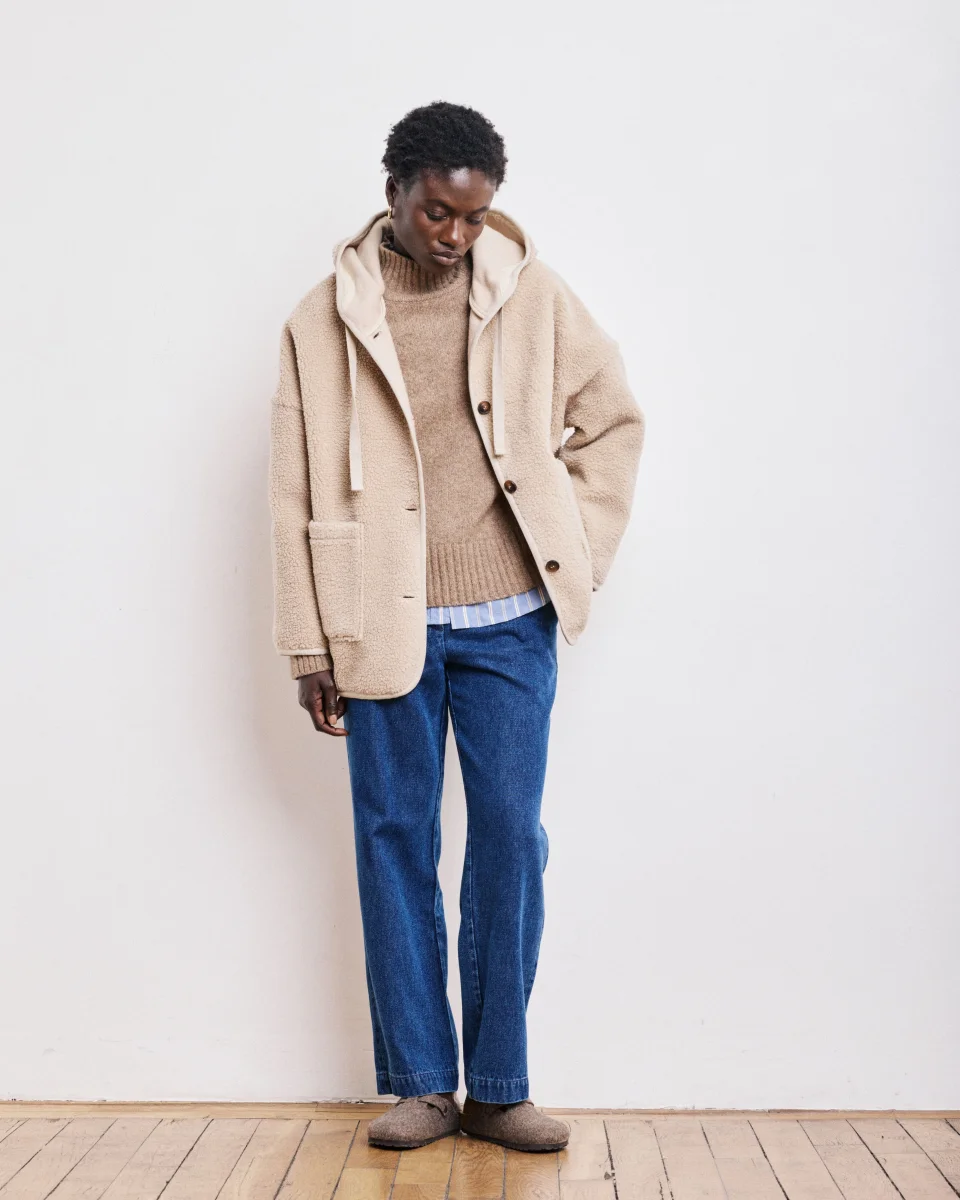 Manteau ample femme à capuche en fausse fourrure sherpa, non doublé. Emmanchures tombantes et deux poches plaquées devant. Cordon de serrage à gros grains. Finitions biais en coton ton sur ton.