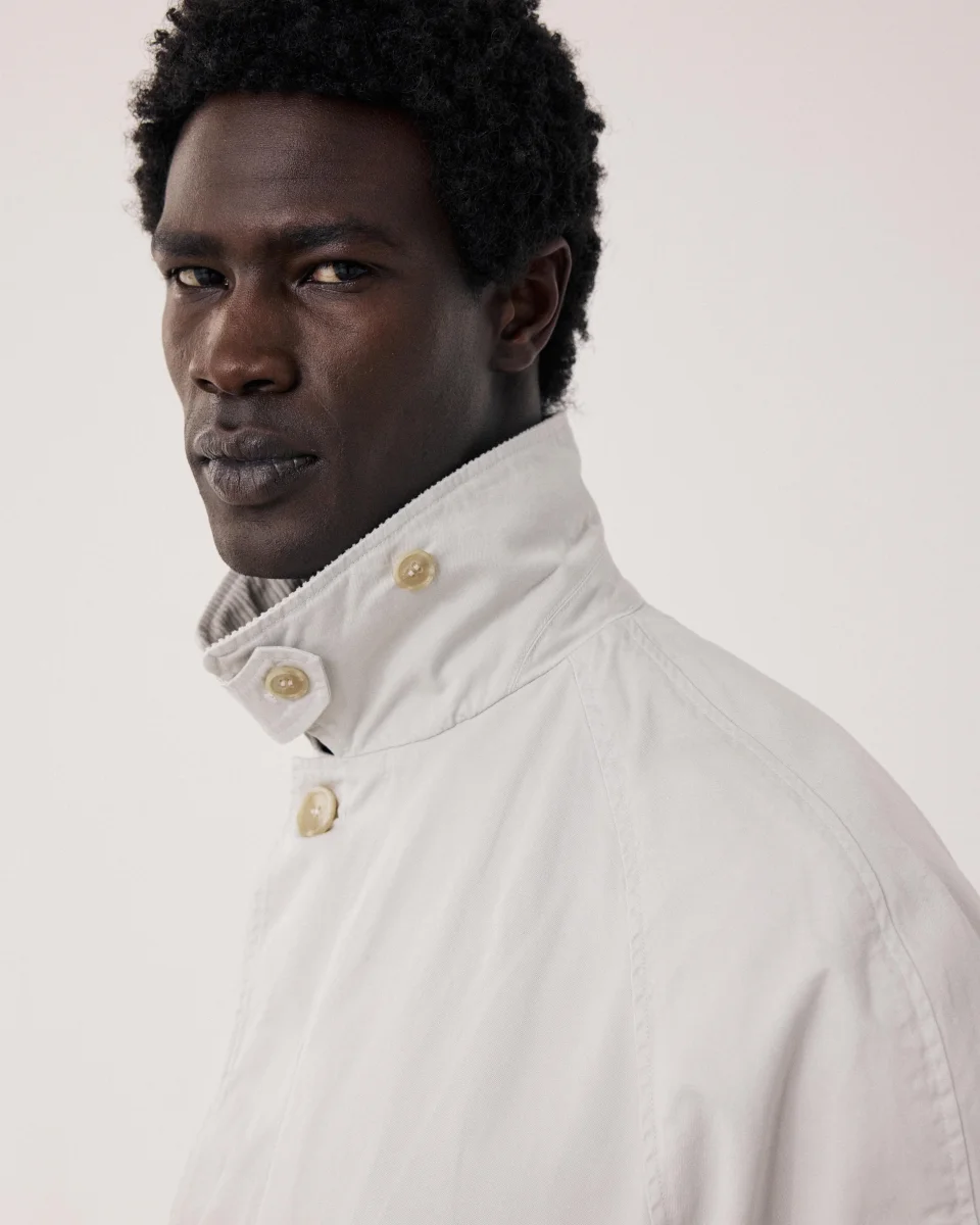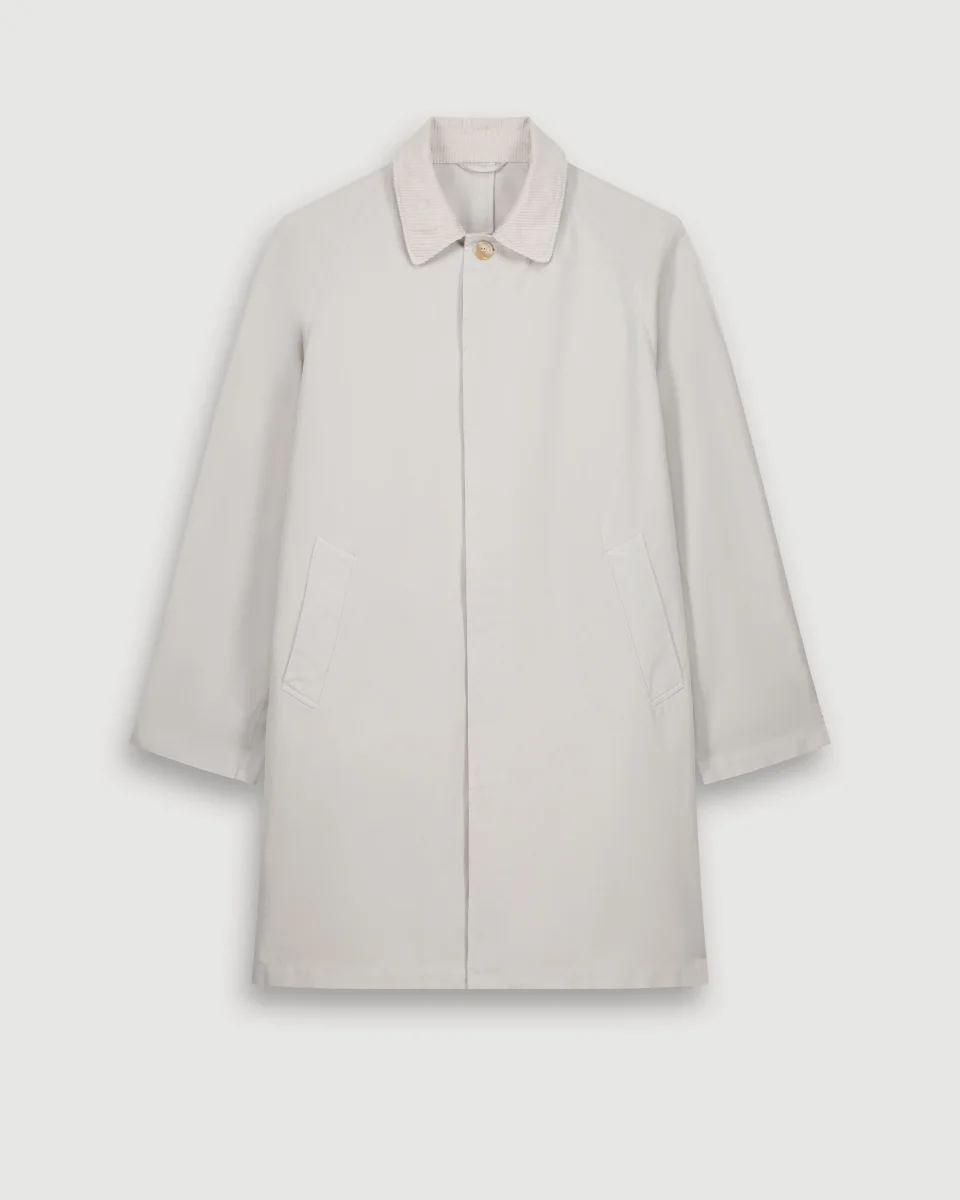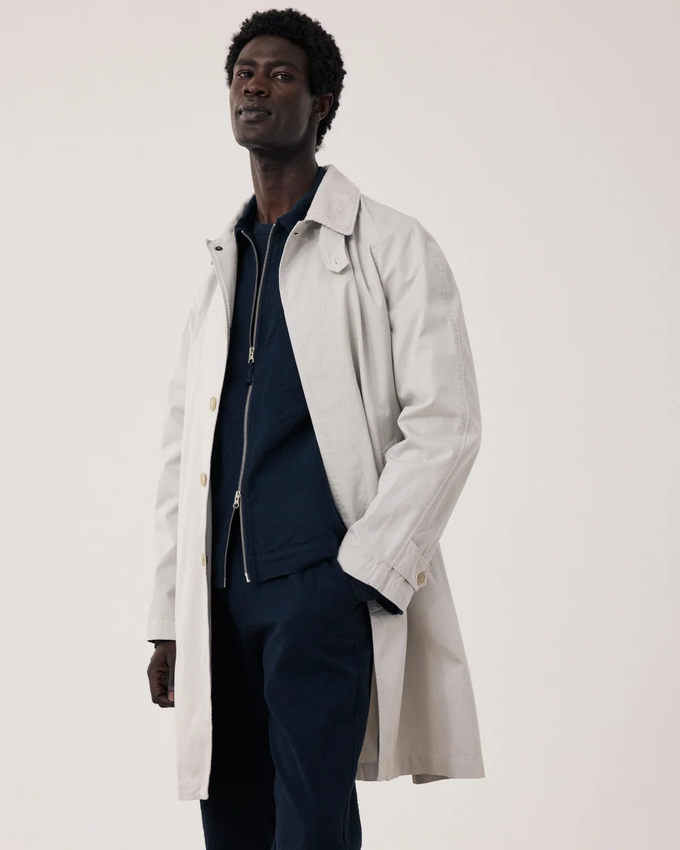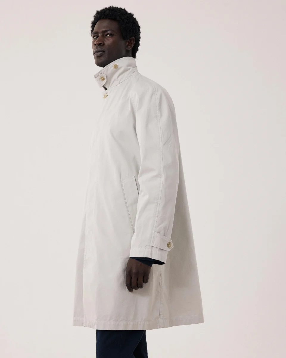 Manteau « trench » homme long avec col réglable. Coupe droite. Patte de boutonnage invisible. Deux poches biais. Deux poches intérieures dont une boutonnée. Pattes de serrage aux poignets. Fente d’aisance.