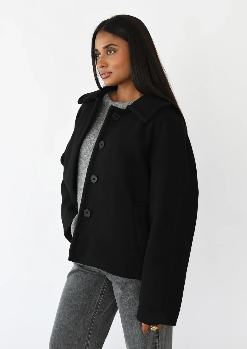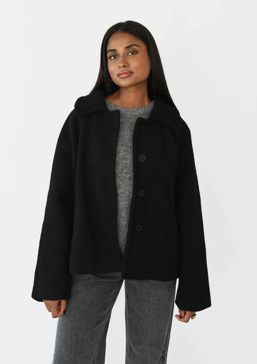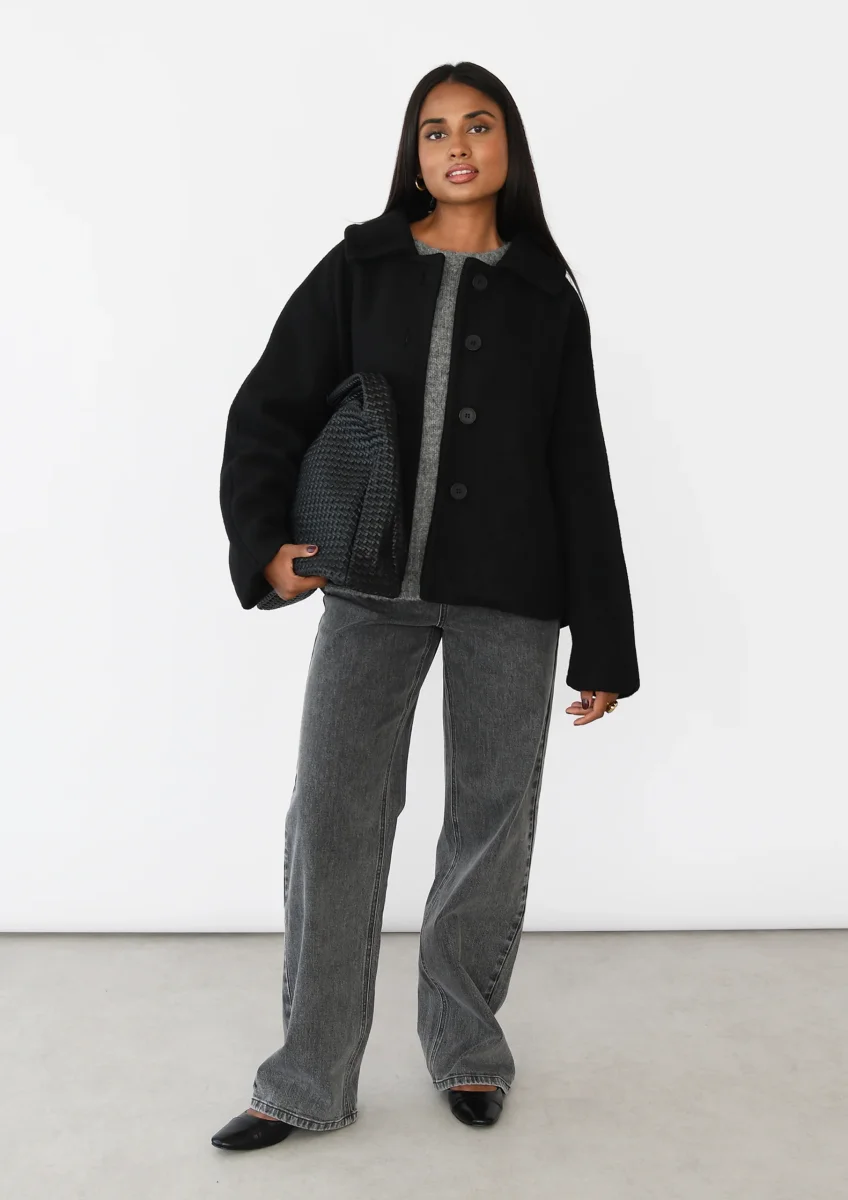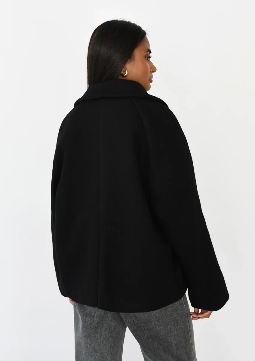 Manteau court Tissu de laine mélangéCoupe ampleDétail liseré sur les manchesCol avec rabatDeux poches latéralesFermeture boutonnée sur le devant DESCRIPTIF PRODUIT80% polyester – 20% laineINSTRUCTIONSLavage à la main en suivant les instructions portées sur l’étiquette d’entretien