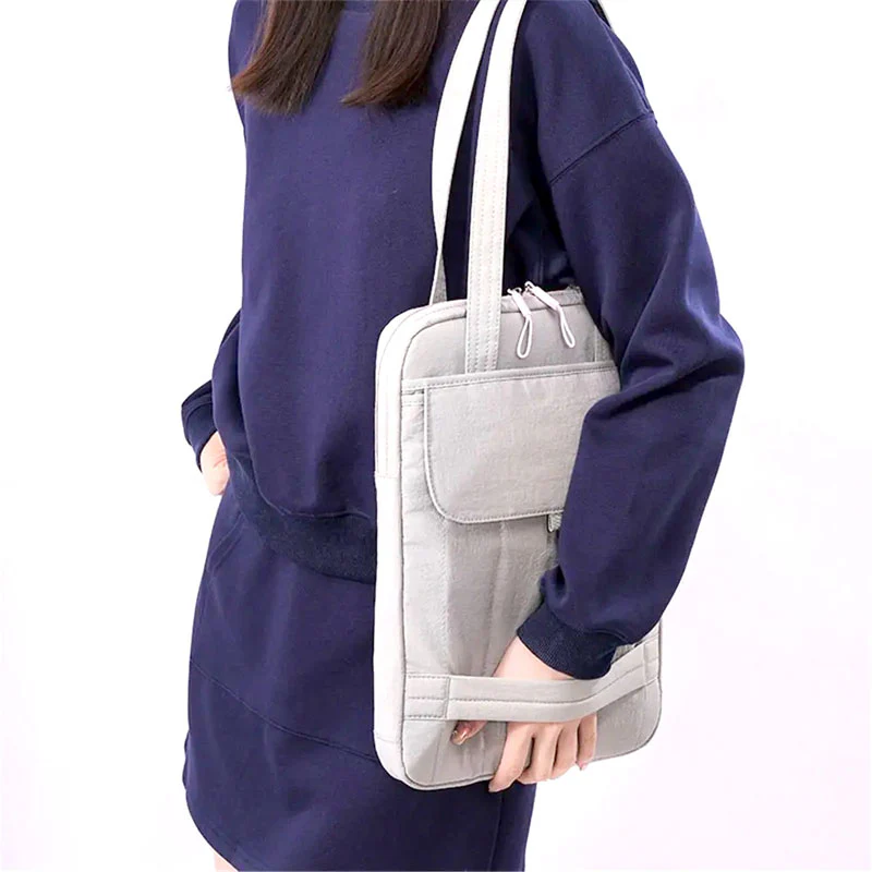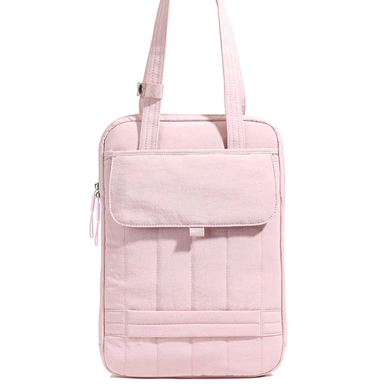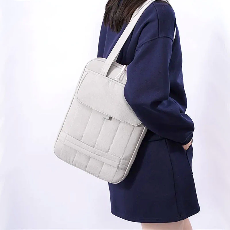 C’est un sac ordinateur façon cocooning, avec sa toile molletonnée. Passé ce premier contact il est possible de ranger les bandoulières pour le tenir à la main, pratique. Sa grande poche avant permet en plus de transporter quelques affaires ou dossiers.