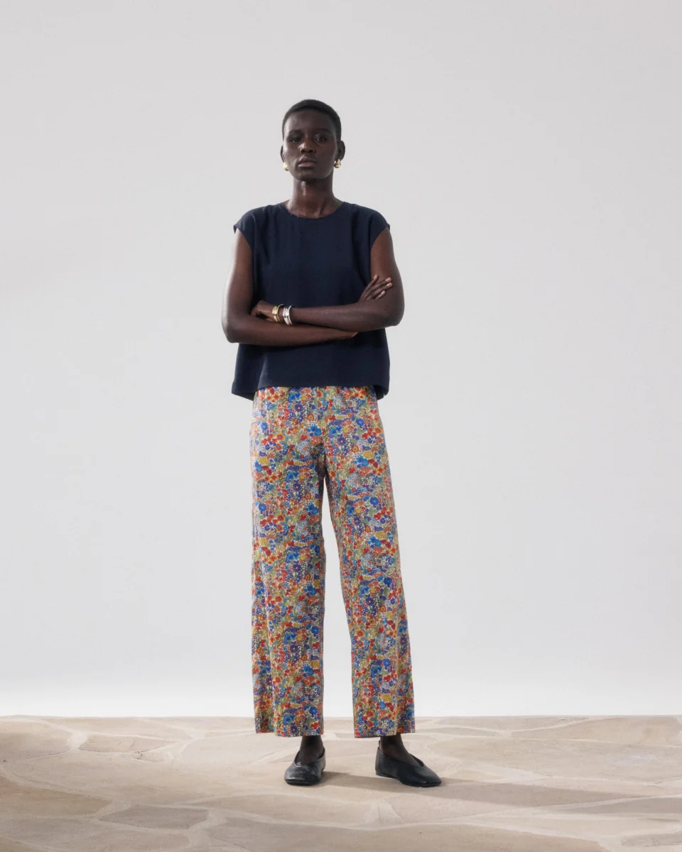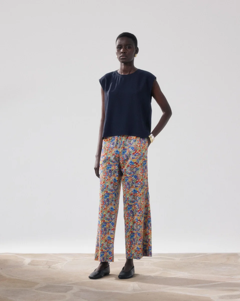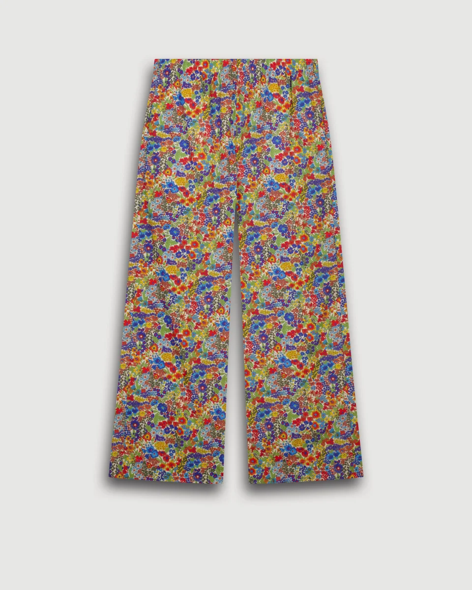 Pantalon large femme longueur 7/8ème. Taille élastique avec fronces et deux poches italiennes sur les côtés.