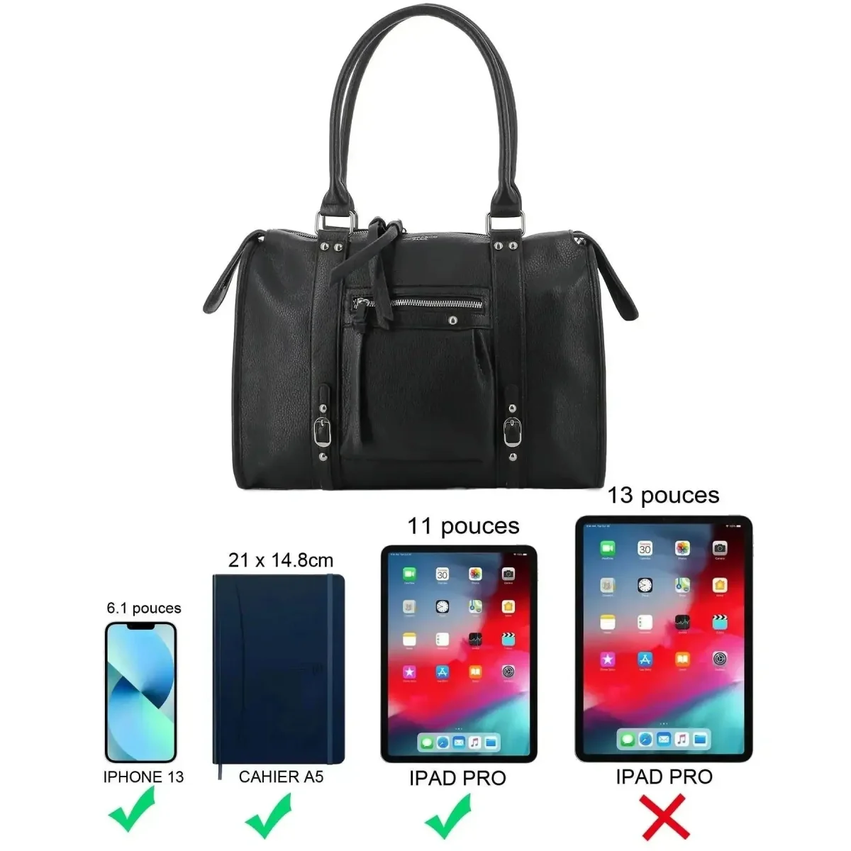 R: Ce petit sac cabas noir grainé est idéal pour organiser vos essentiels quotidiens ! Il est parfait pour transporter votre smartphone, votre portefeuille et vos clés, mais pour les documents A4 ou les cahiers plus grands, nous vous recommandons d’opter pour un sac plus spacieux.