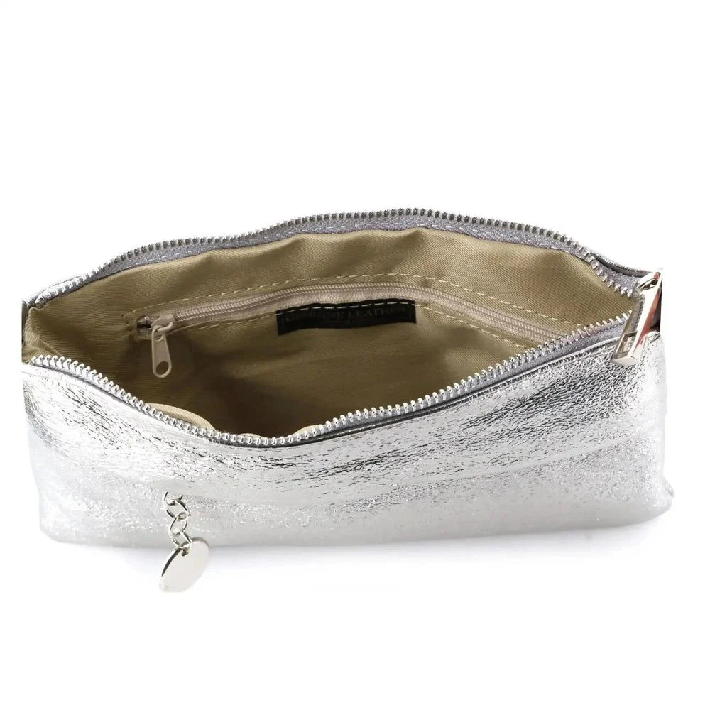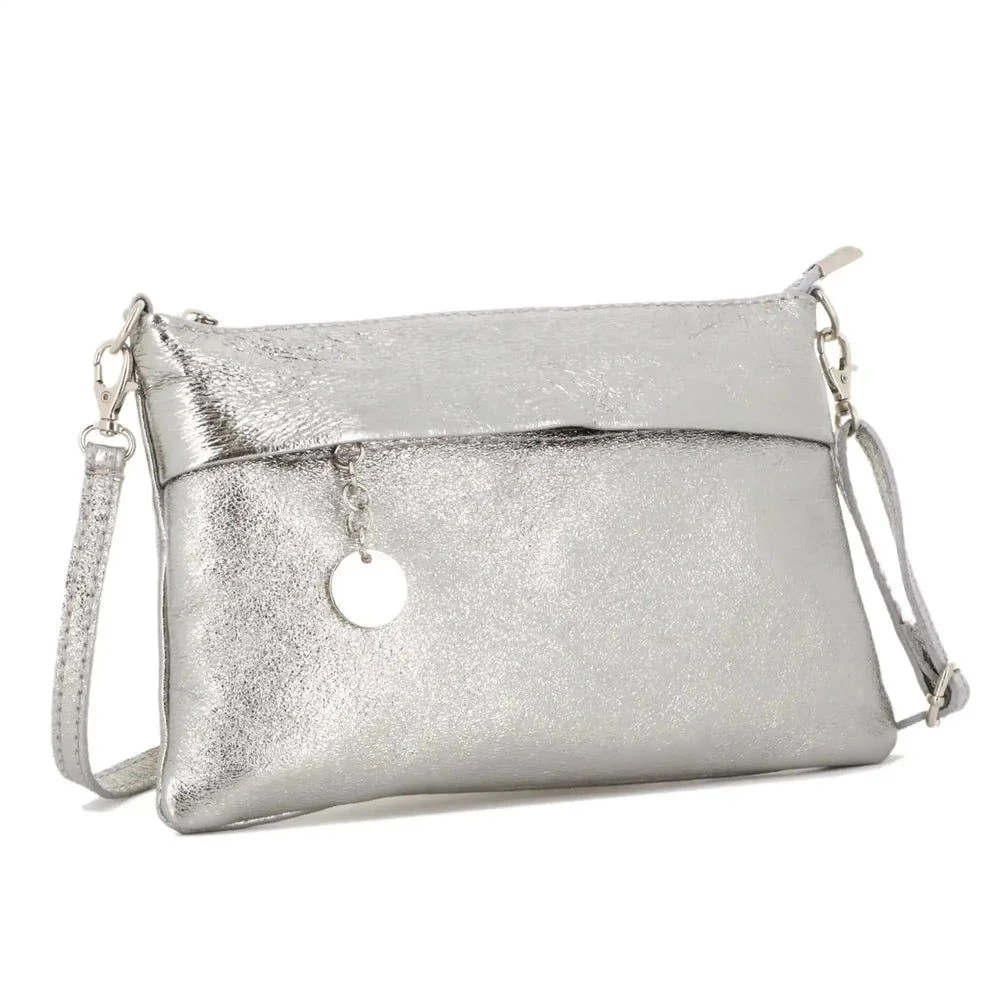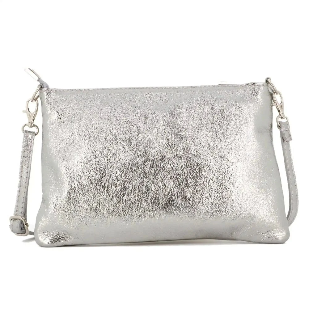 Craquez pour notre petit sac pochette plat avec bandoulière et lanière. Vous serez séduit par son cuir véritable pailleté irisé et son design simple et élégant. Ce sac est l’accessoire parfait pour les fêtes, soirées, cérémonies, mariages, ou encore pour vos sorties week-end et entre amis.