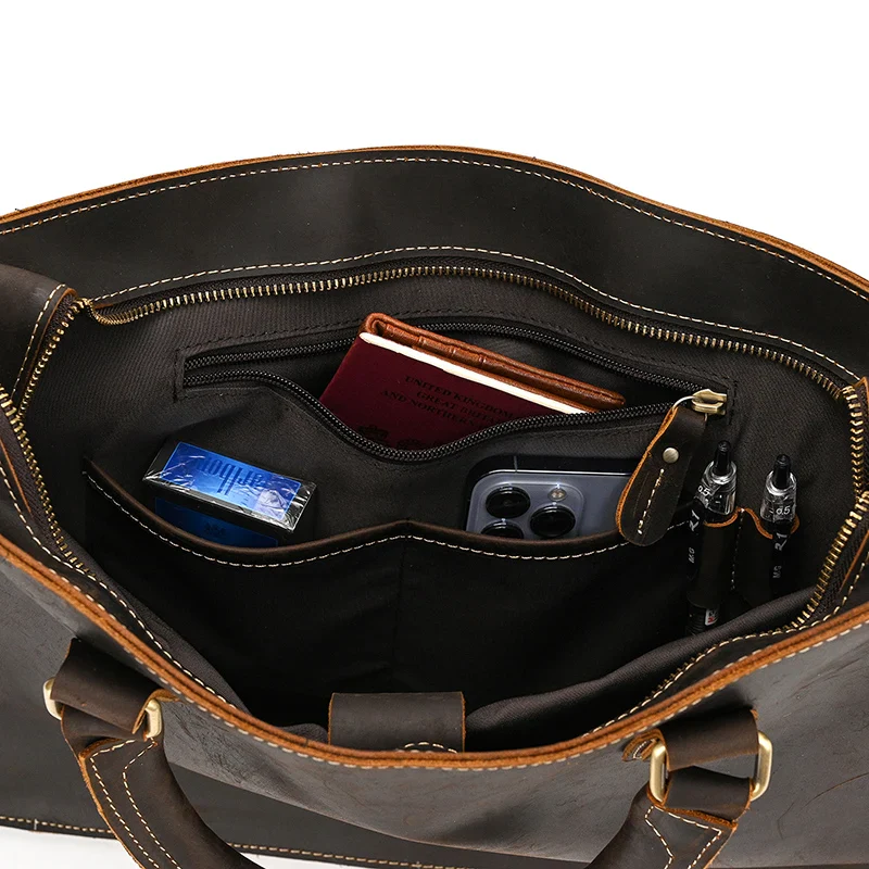 À l’intérieur, ce porte-document est parfaitement organisé pour répondre à tous vos besoins. Il dispose de plusieurs compartiments spacieux, permettant de ranger vos documents, votre ordinateur portable, vos stylos et autres accessoires essentiels en toute sécurité. Une doublure intérieure en tissu doux protège vos affaires des éraflures et des dommages.
