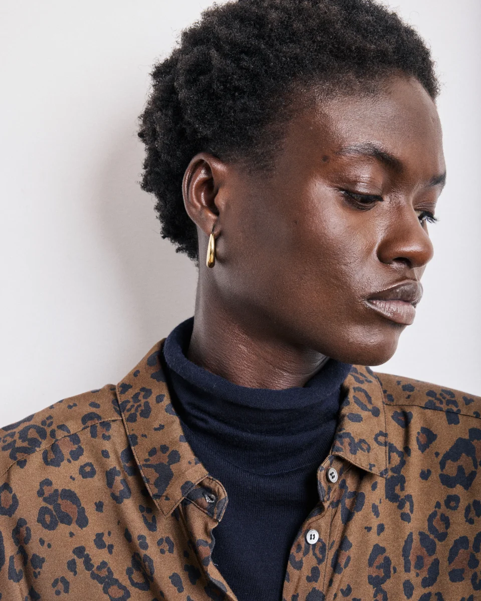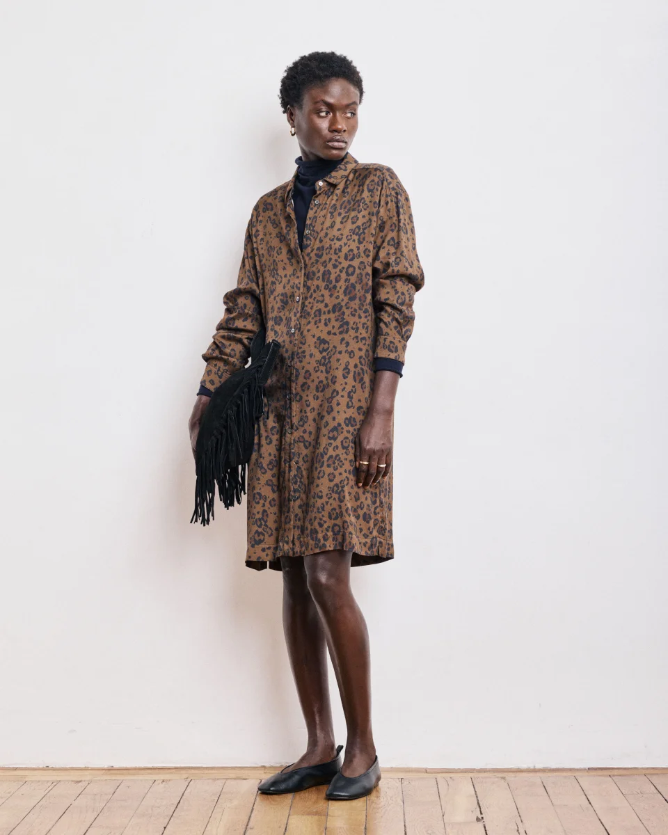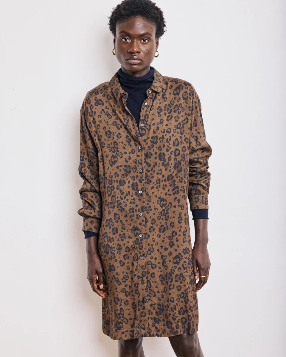Robe-chemise femme ample en satin de viscose imprimé léopard exclusif, longueur au-dessus des genoux. Emmanchures tombantes et patte de boutonnage apparente avec boutons en nacre. Petites fentes latérales.