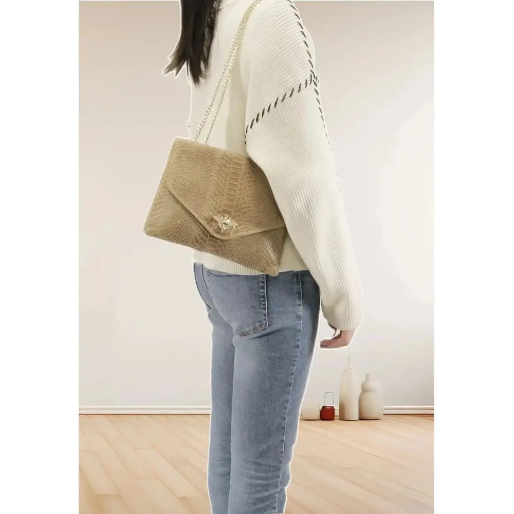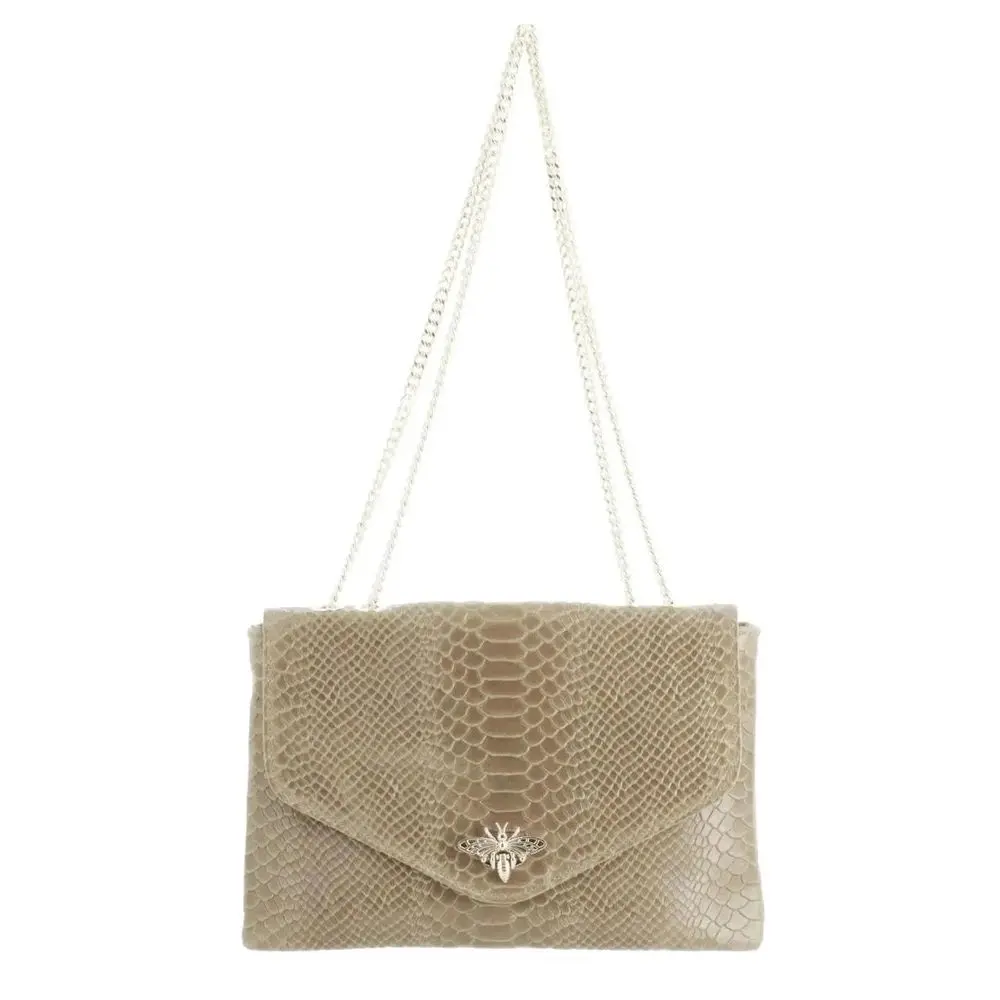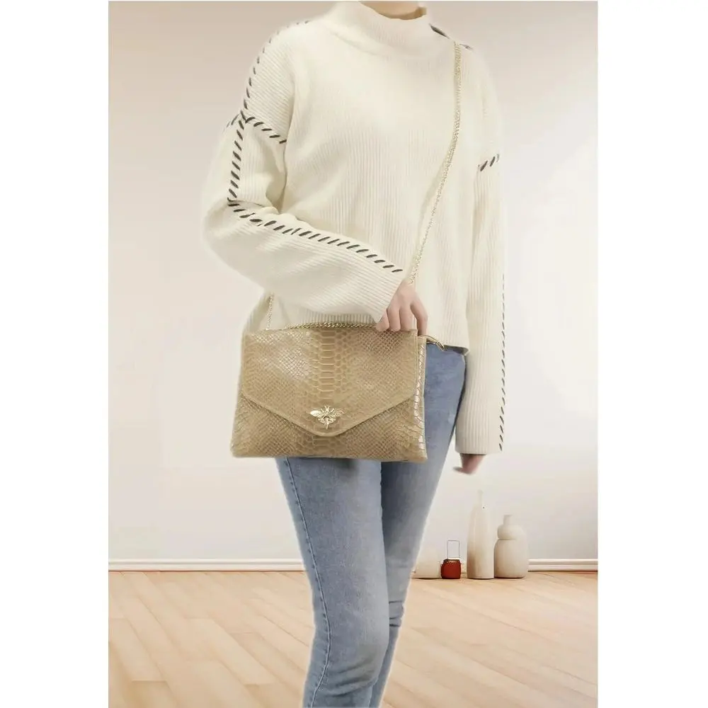 Sac bandoulière pochette en cuir crocodile véritable, avec design abeille dorée. Parfait pour les soirées, cérémonies, ou sorties. Dimensions : L 28 x H 19.5 x P 3 cm. Bandoulière dorée, porté épaule ou crossbody. 1 compartiment principal, 1 poche zippée à l’intérieur, 1 pochette arrière. élégant et pratique.