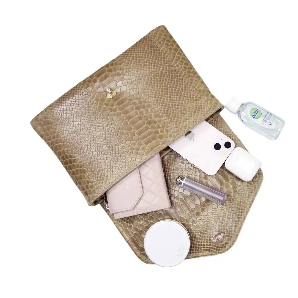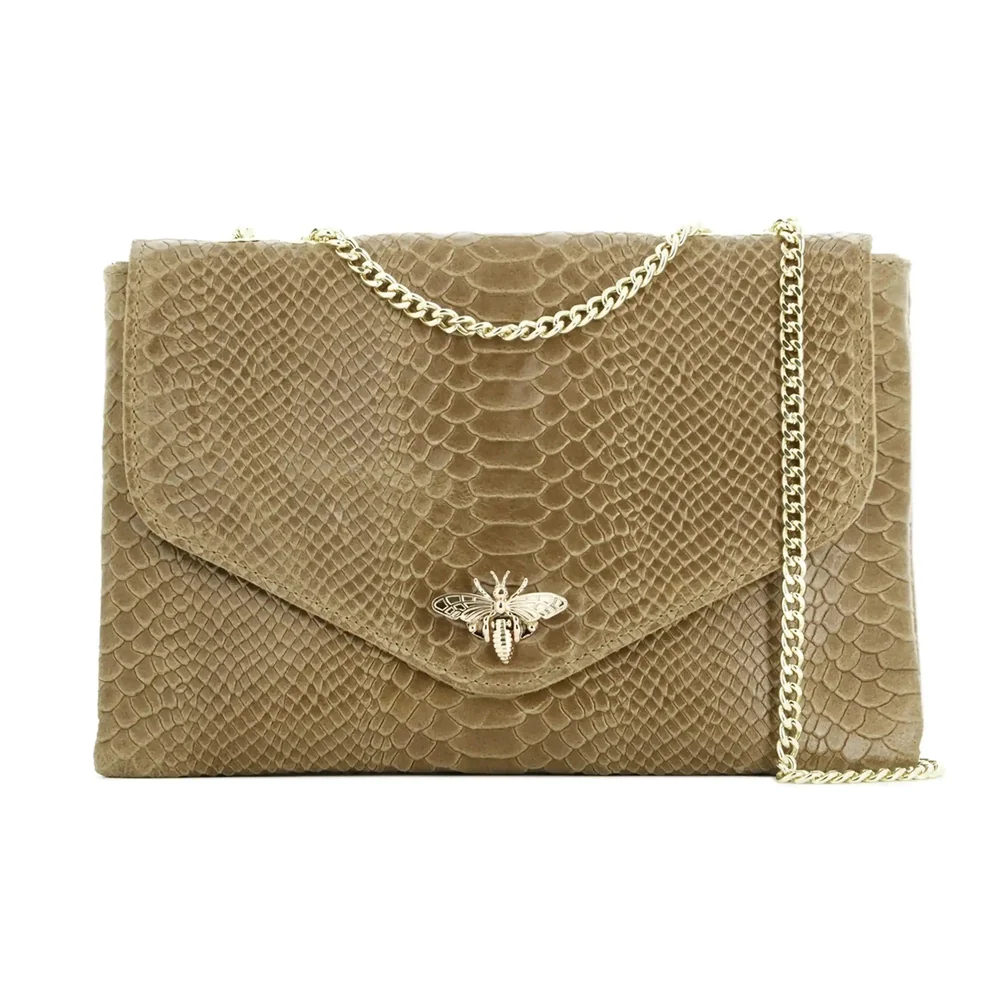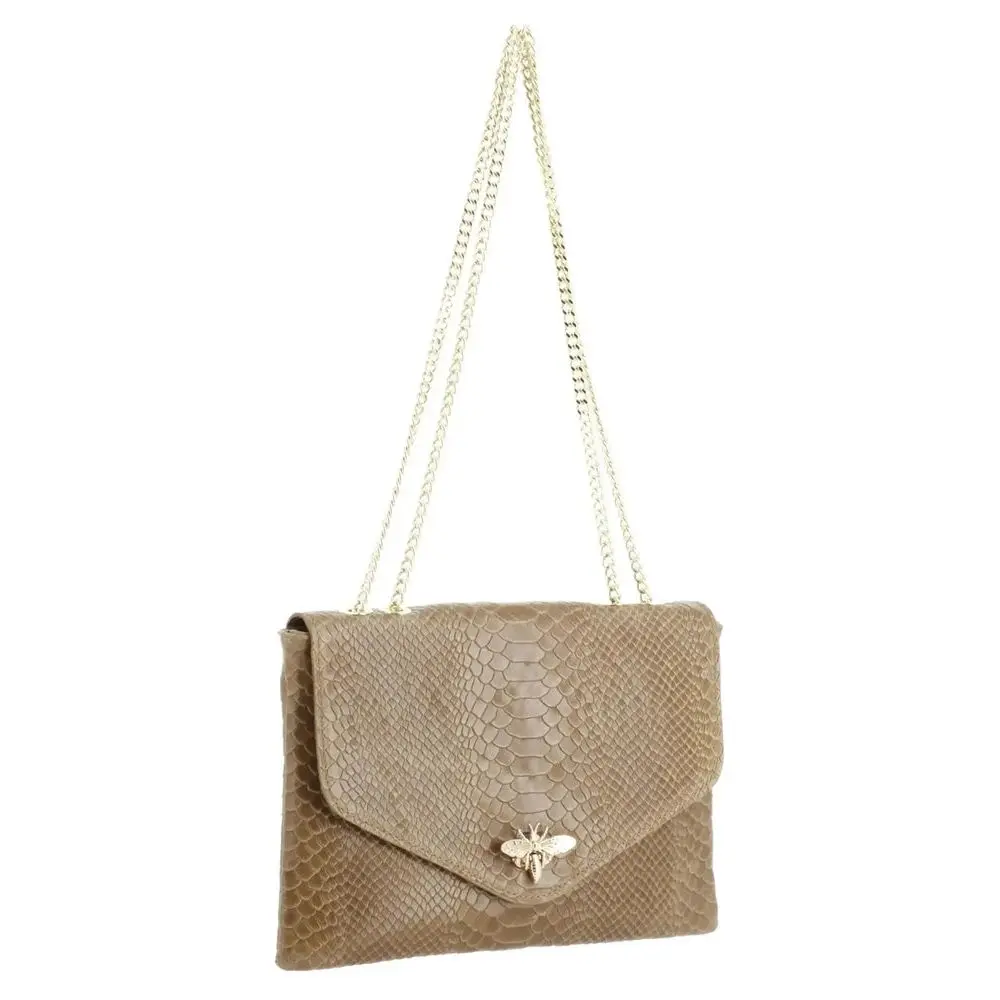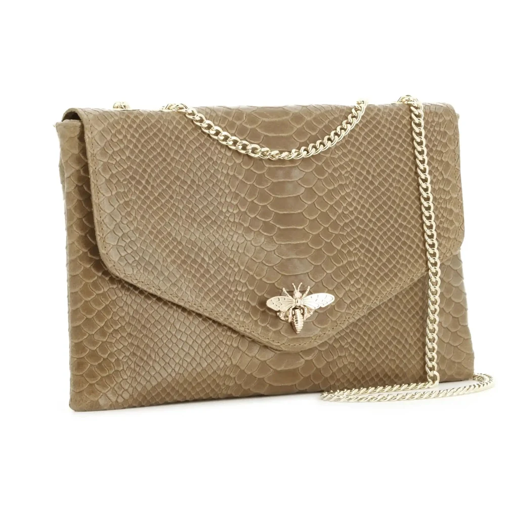 Sac bandoulière pochette en cuir crocodile véritable, avec design abeille dorée. Parfait pour les soirées, cérémonies, ou sorties. Dimensions : L 28 x H 19.5 x P 3 cm. Bandoulière dorée, porté épaule ou crossbody. 1 compartiment principal, 1 poche zippée à l’intérieur, 1 pochette arrière. élégant et pratique.