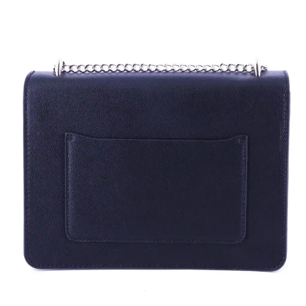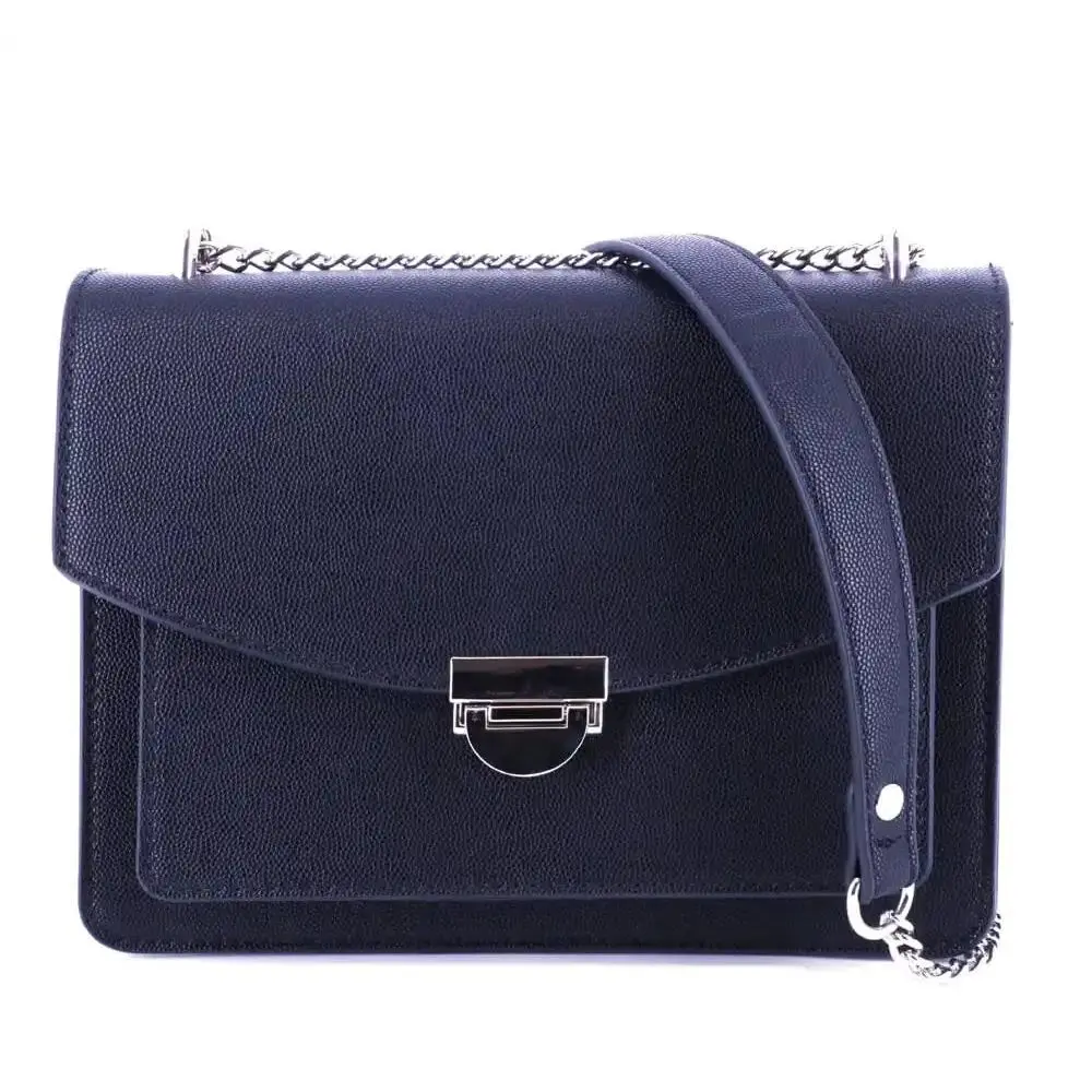 Laissez-vous séduire par ce sac en cuir synthétique embossé façon grain, au design élégant et moderne. Son esprit couture est sublimé par deux détails en métal argenté : une boucle pivotante, à basculer vers le haut ou le bas, et une bandoulière-chaînette agrémentée d’une large bande synthétique pour un confort optimal à l’épaule. Idéal pour un porté long ou en bandoulière croisée.