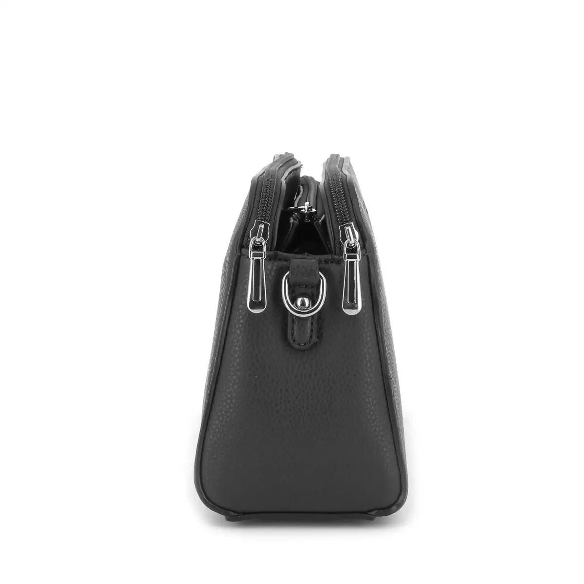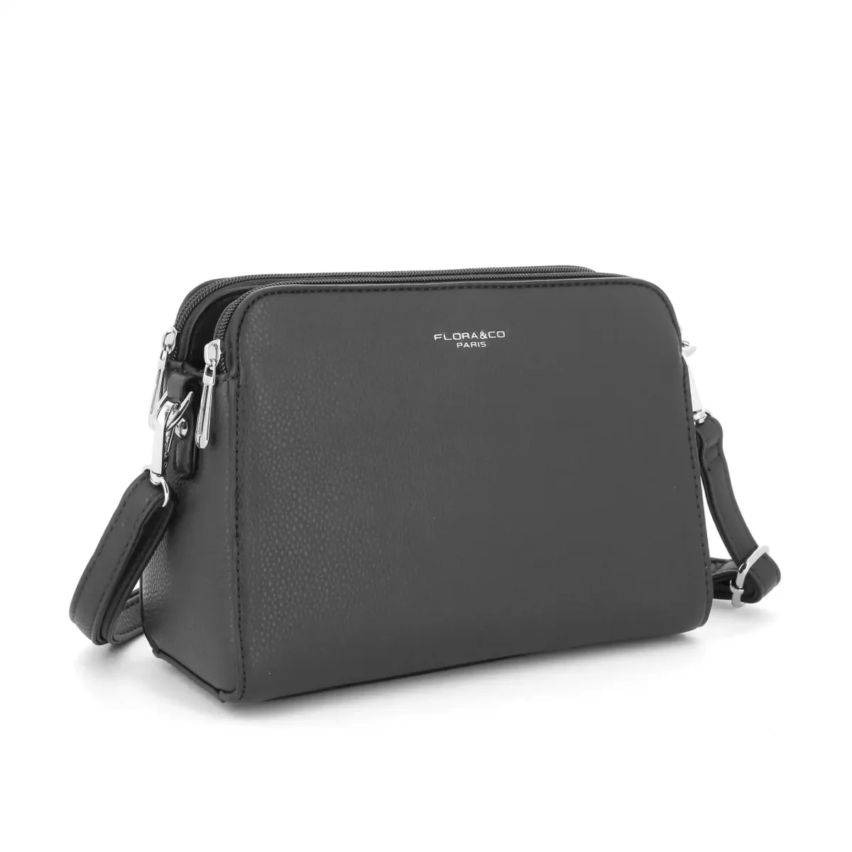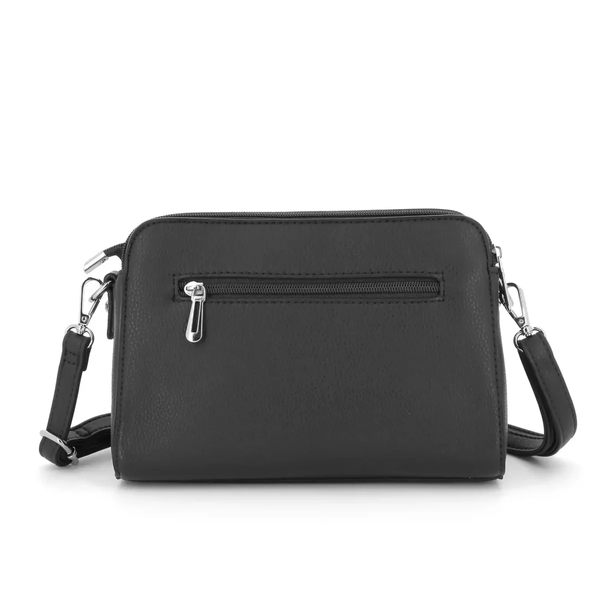Sac bandoulière trapèze en similicuir grainé, design moderne avec 3 compartiments zippés. Dimensions : 24x17x11 cm. 2 poches intérieures, 1 poche zippée à l’arrière, bandoulière ajustable.