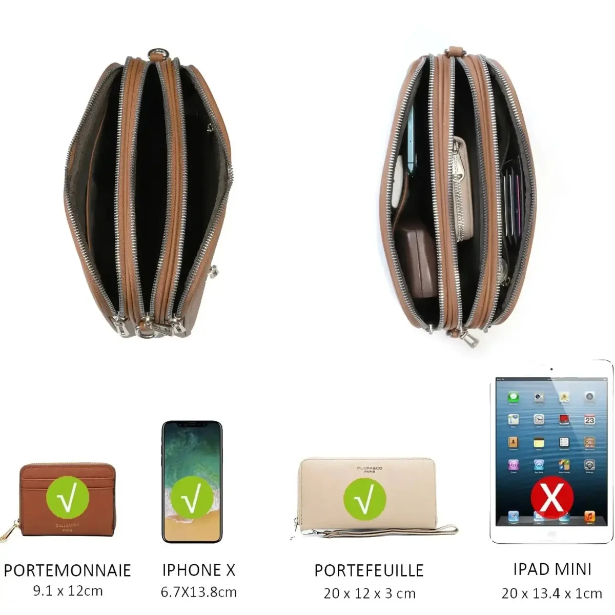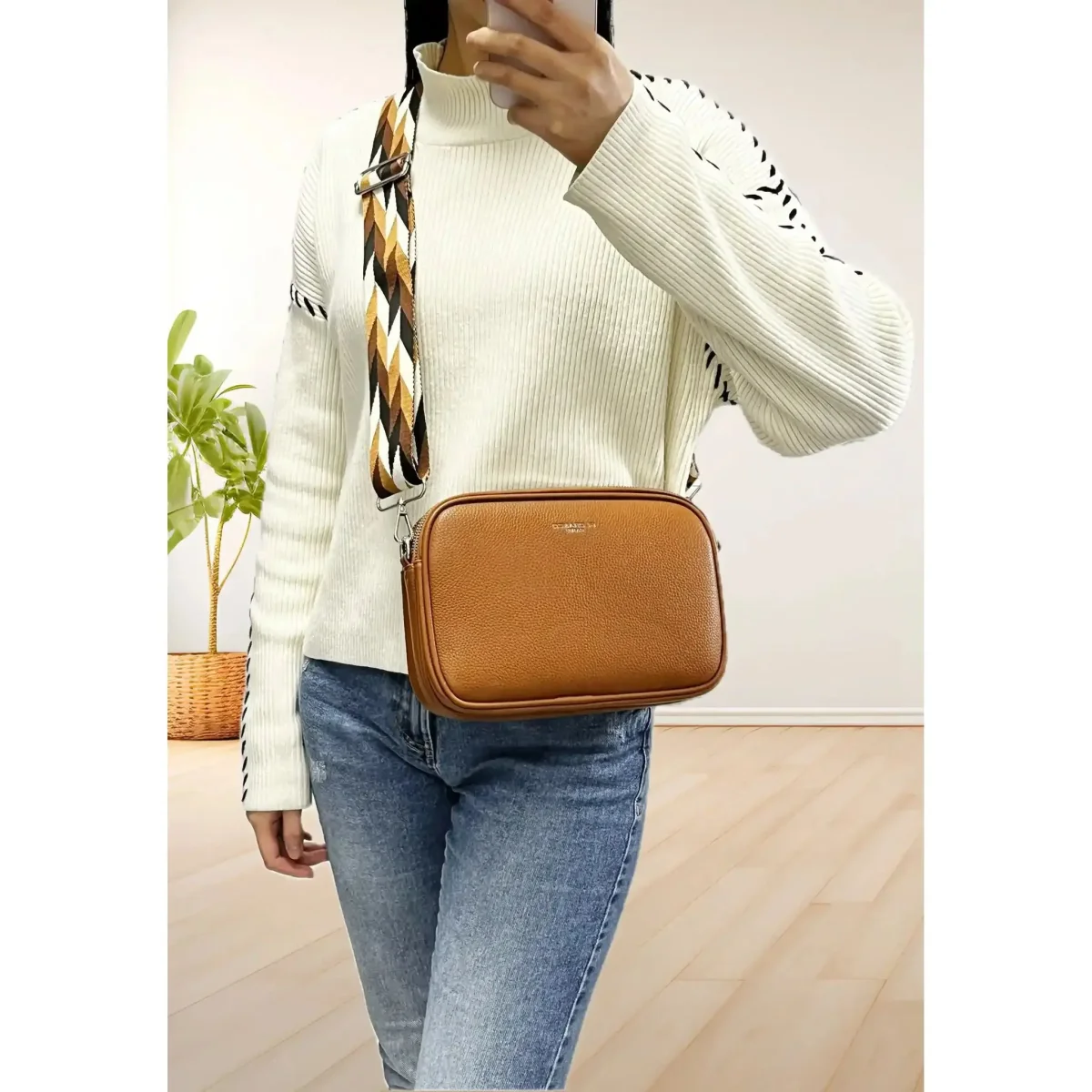 sac bandoulière large en similicuir grainé, 22x16x8 cm. Bandoulière classique ou large géométrique pour confort et style. 3 compartiments, poches zippées pour organiser vos essentiels.