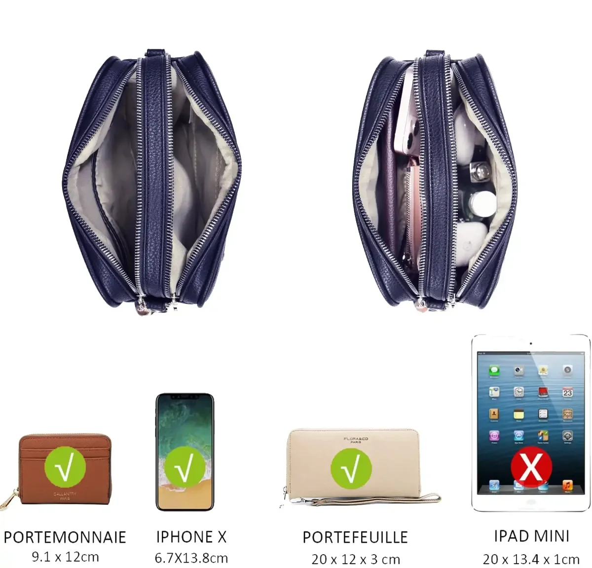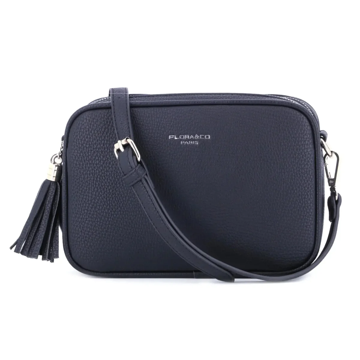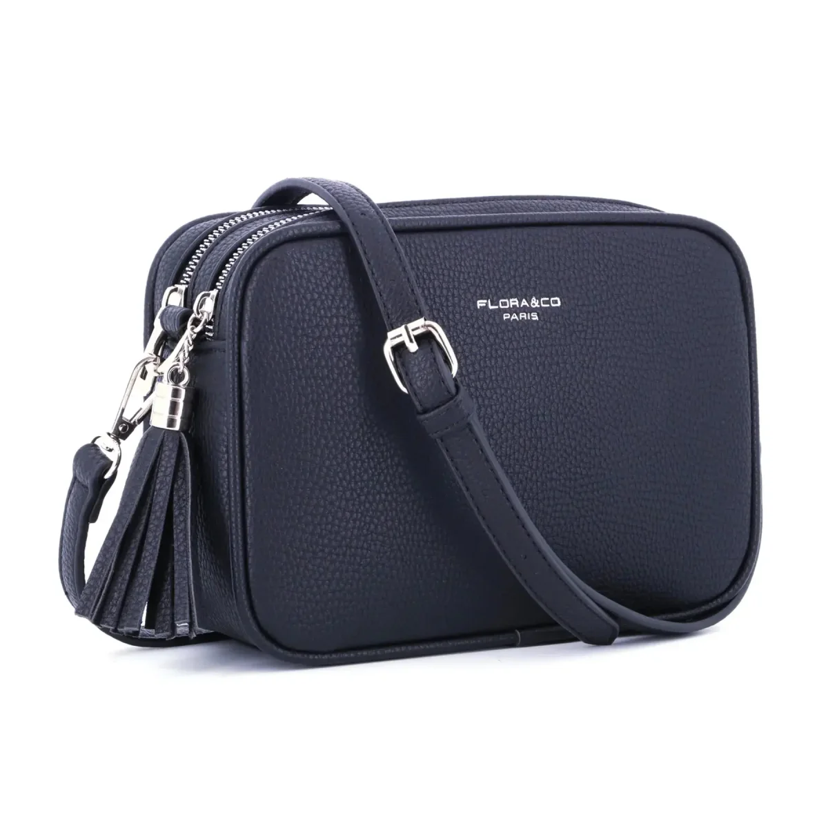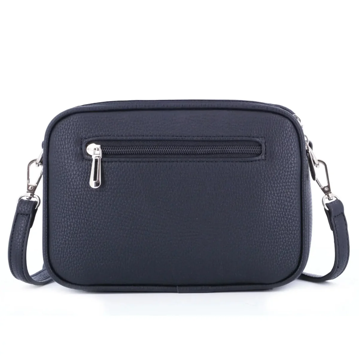 sac bandoulière rectangle en similicuir grainé, design moderne avec boucle argentée et double fermeture éclair. Dimensions : 22x16x8 cm. 2 compartiments, 1 poche zippée au dos, bandoulière ajustable.