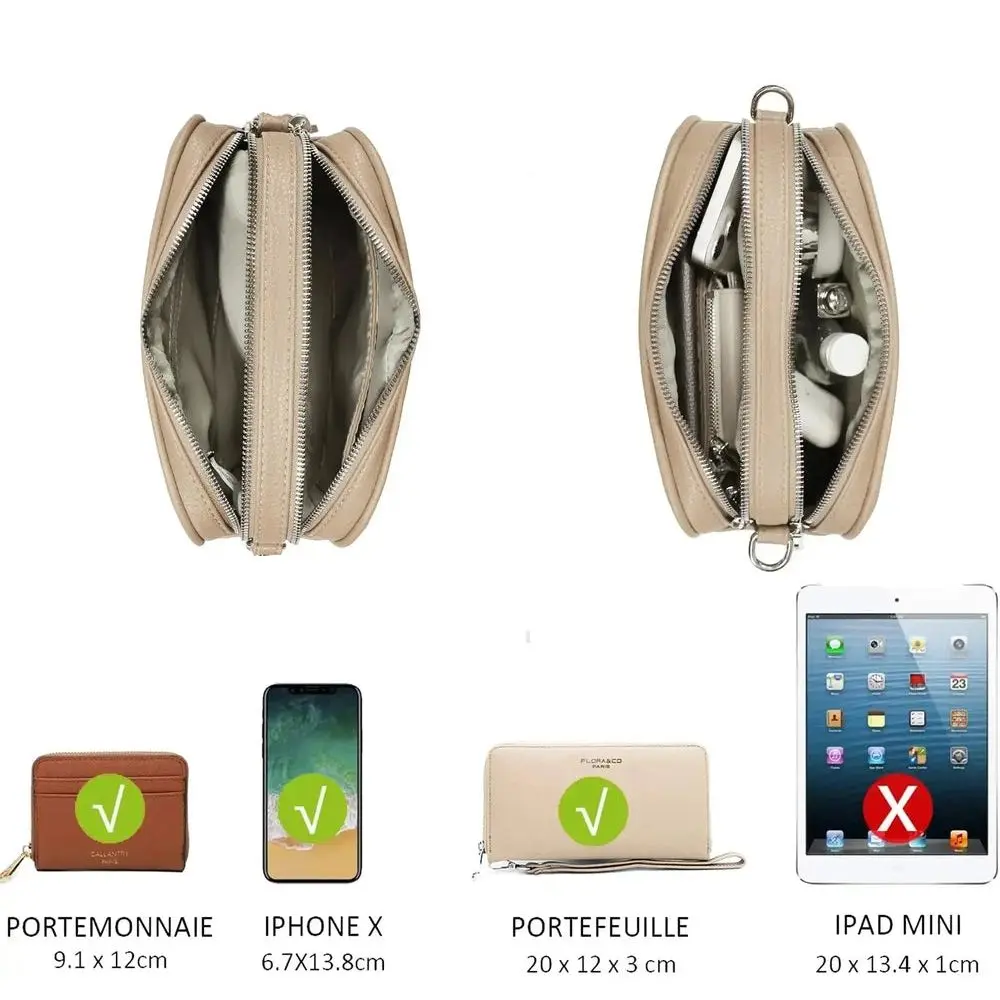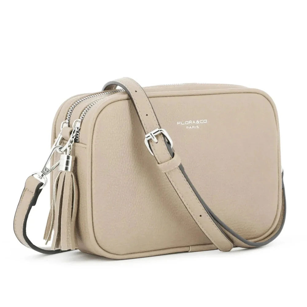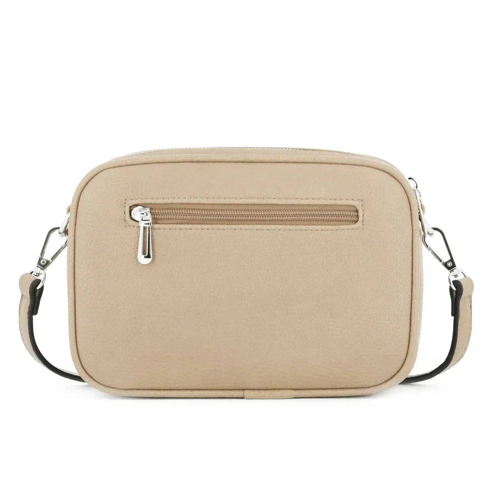 sac bandoulière rectangle en similicuir grainé, design moderne avec boucle argentée et double fermeture éclair. Dimensions : 22x16x8 cm. 2 compartiments, 1 poche zippée au dos, bandoulière ajustable.