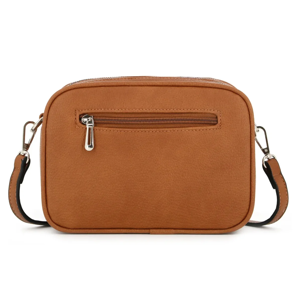 sac bandoulière rectangle en similicuir grainé, design moderne avec boucle argentée et double fermeture éclair. Dimensions : 22x16x8 cm. 2 compartiments, 1 poche zippée au dos, bandoulière ajustable.