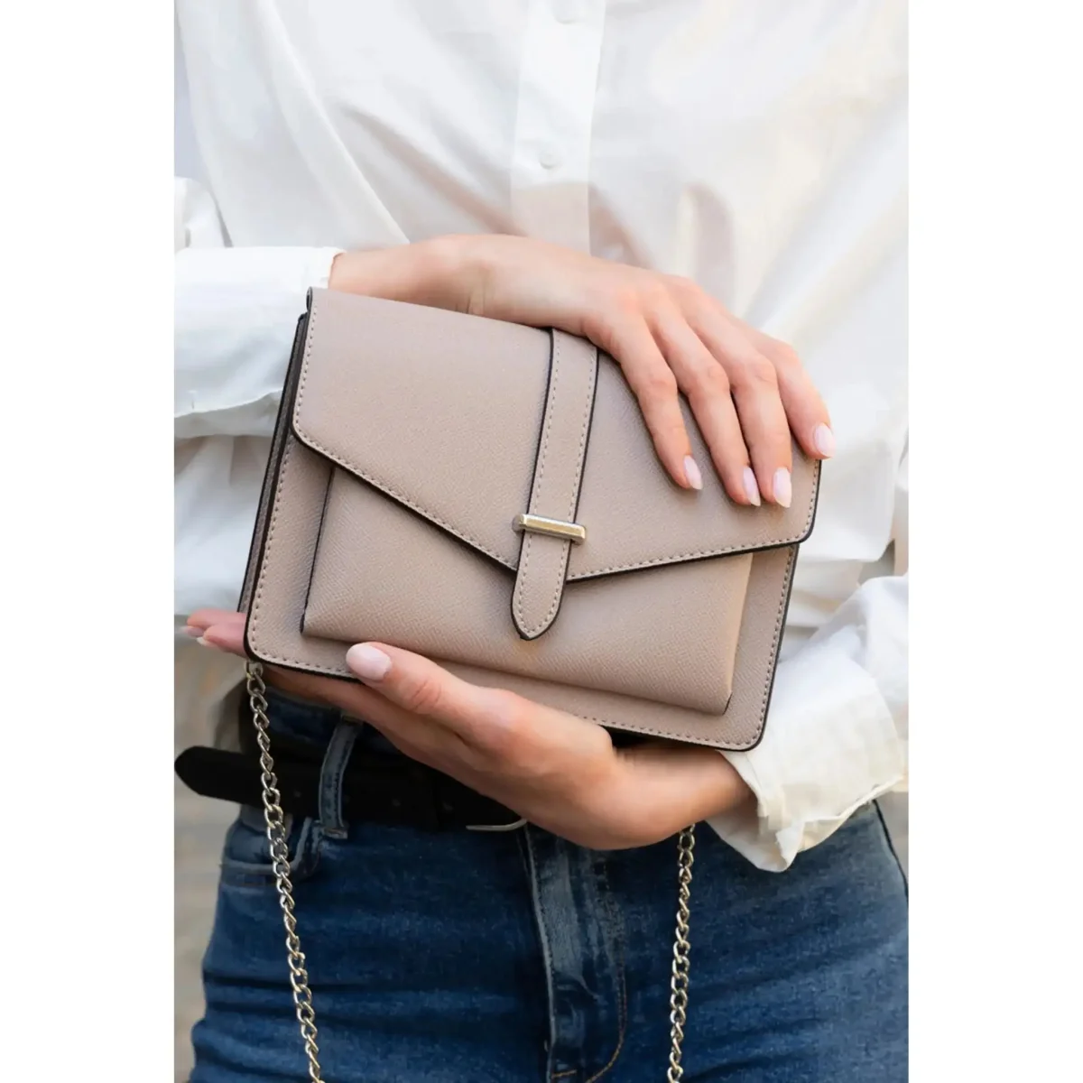 Ce sac à main en cuir synthétique affiche un design épuré et élégant. Sa fermeture à rabat magnétique, ornée d’une boucle raffinée, ajoute une touche sophistiquée. Compact et pratique, il est doté d’une bandoulière fine et d’une chaîne, idéale pour un porté épaule ou croisé. Parfait pour les occasions formelles ou décontractées, il combine style et praticité.