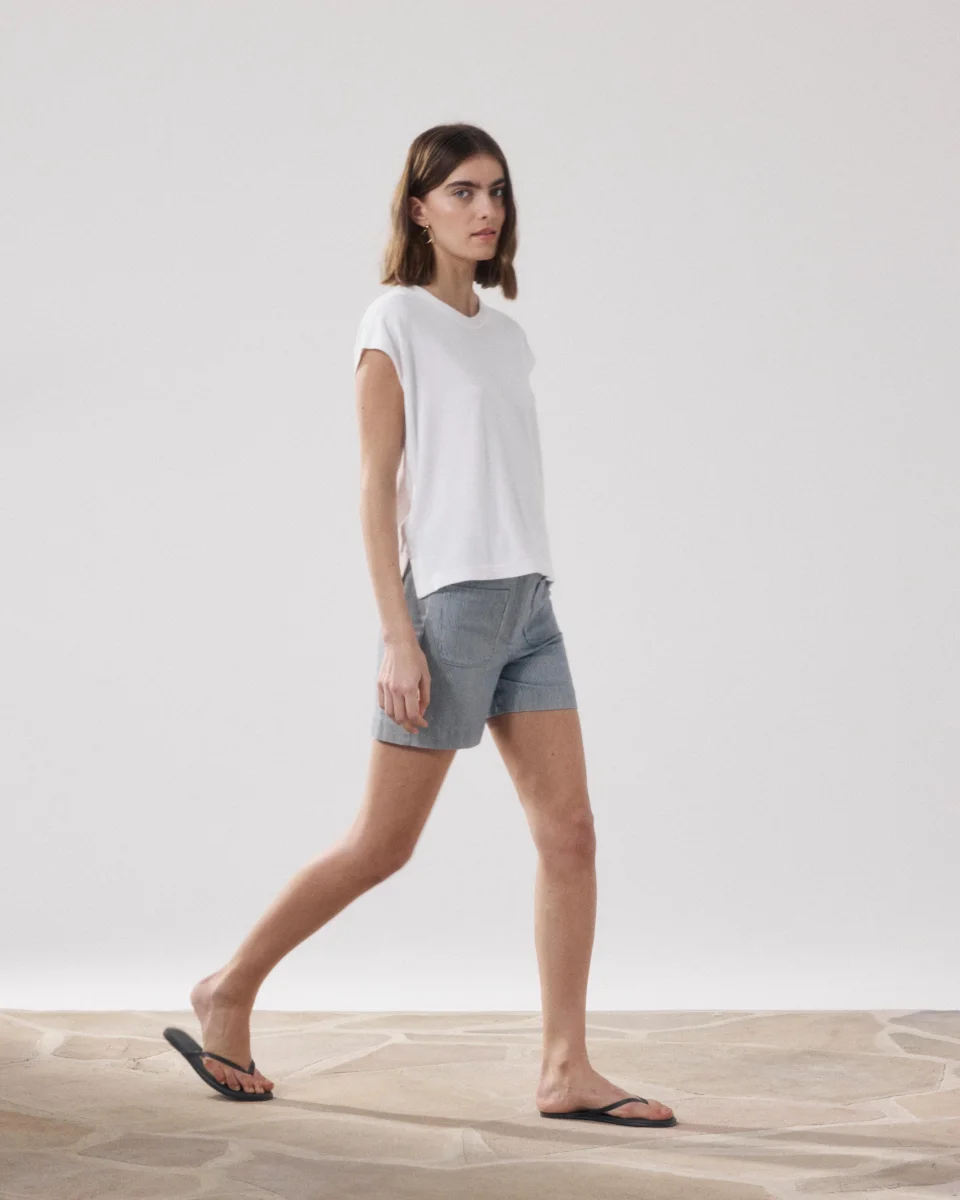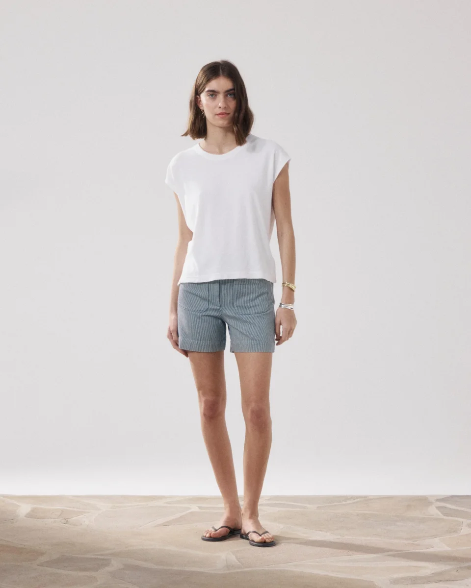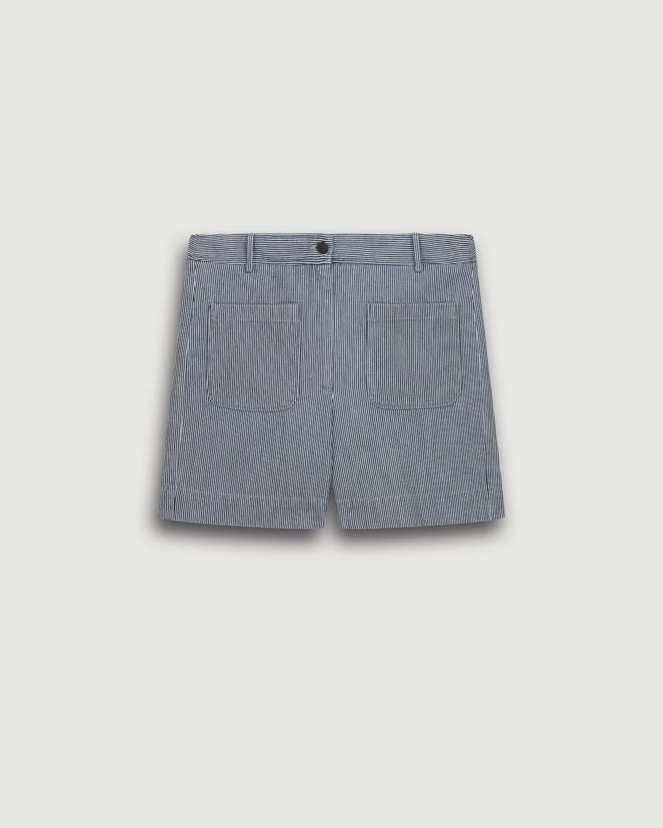 Short femme. Ceinture plate avec passants. Fermeture éclair boutonnée. Deux poches plaquées devant. Deux poches passepoilées boutonnées arrière.