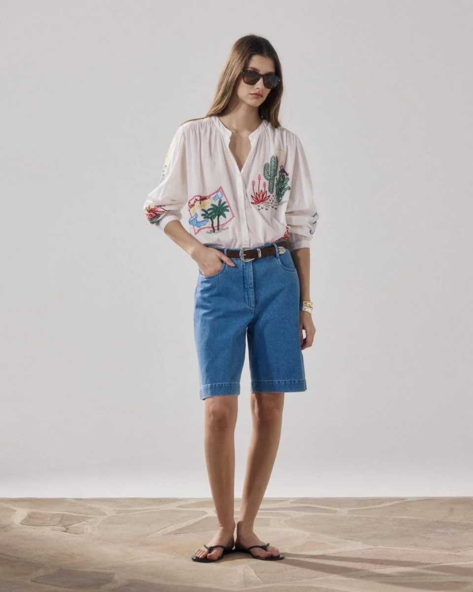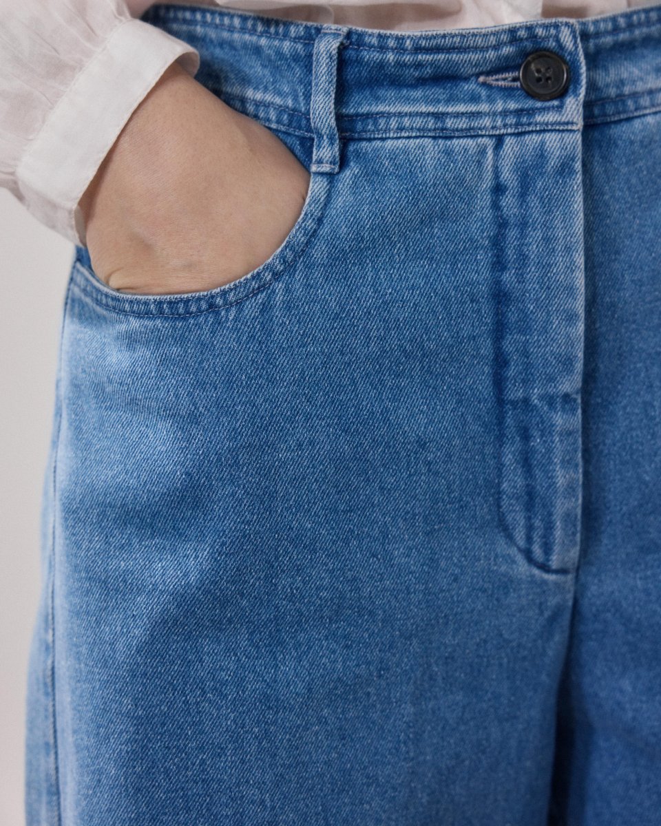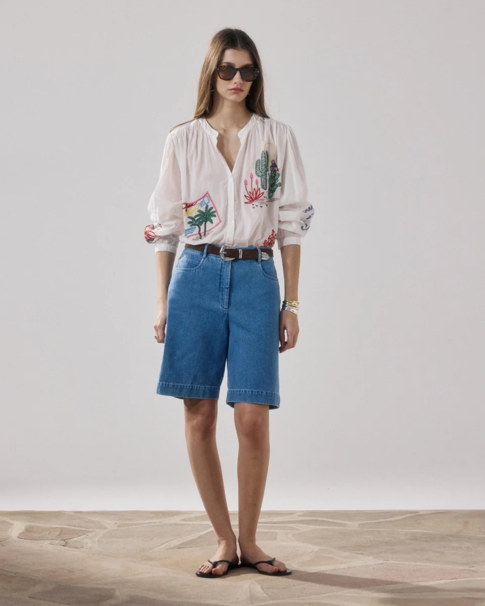 Bermuda femme 5-poches. Coupe droite. Ceinture plate avec passants. Fermeture glissière boutonnée.