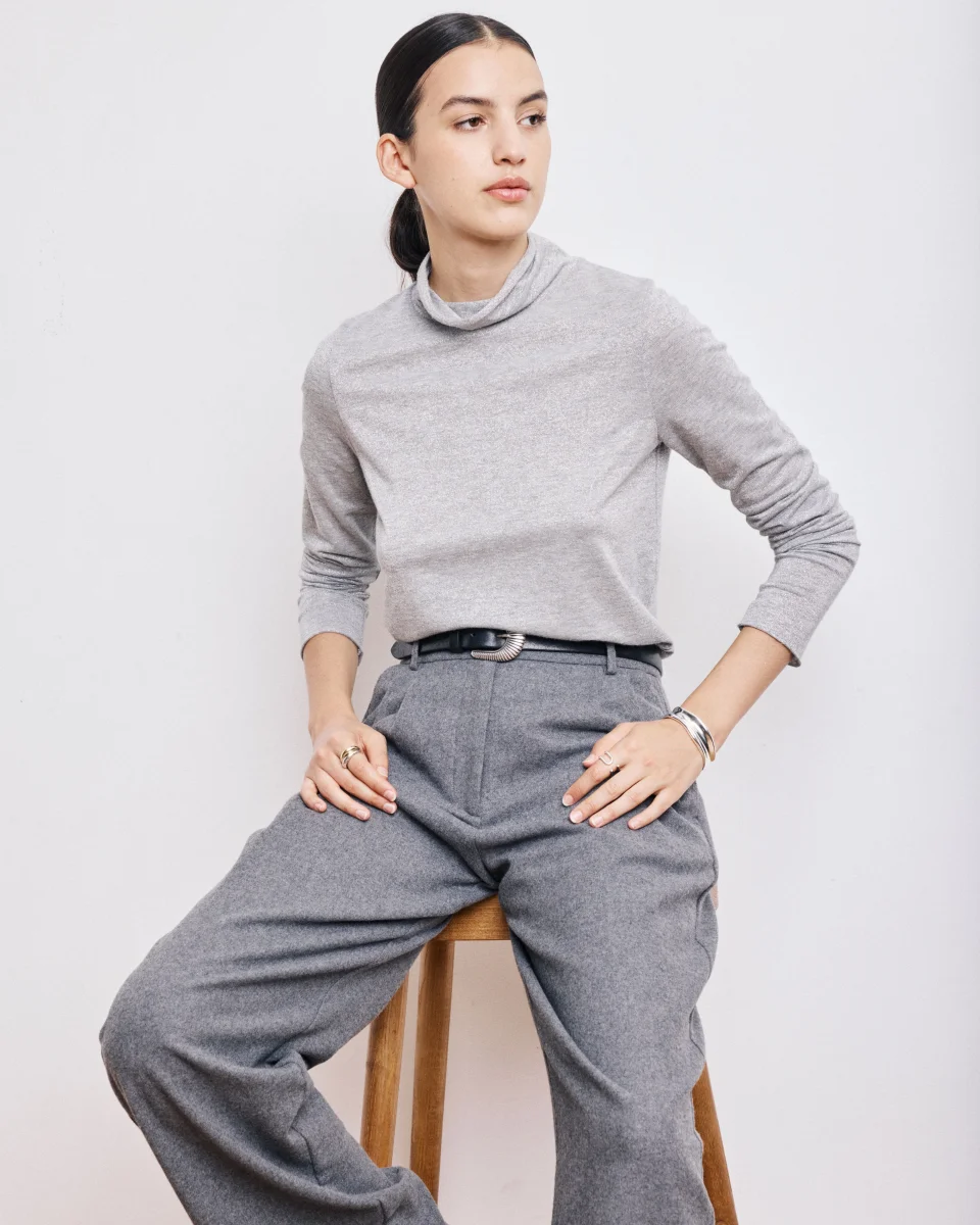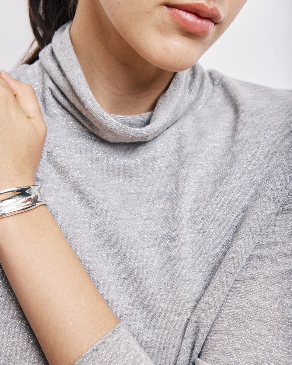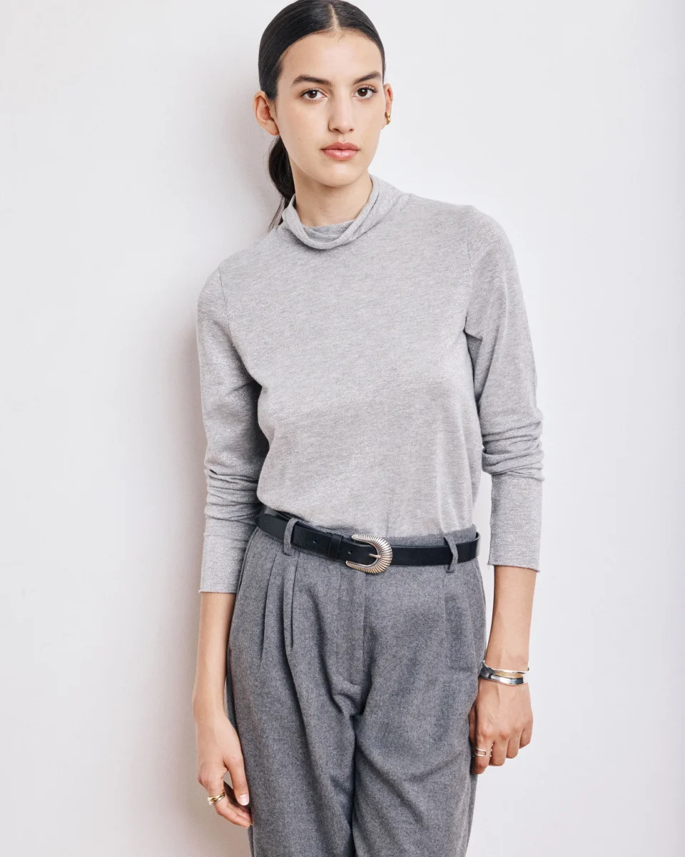 T-shirt femme en lurex Gris à col montant et manches longues avec une coupe ajustée. Finitions col et bas de manches bords francs.