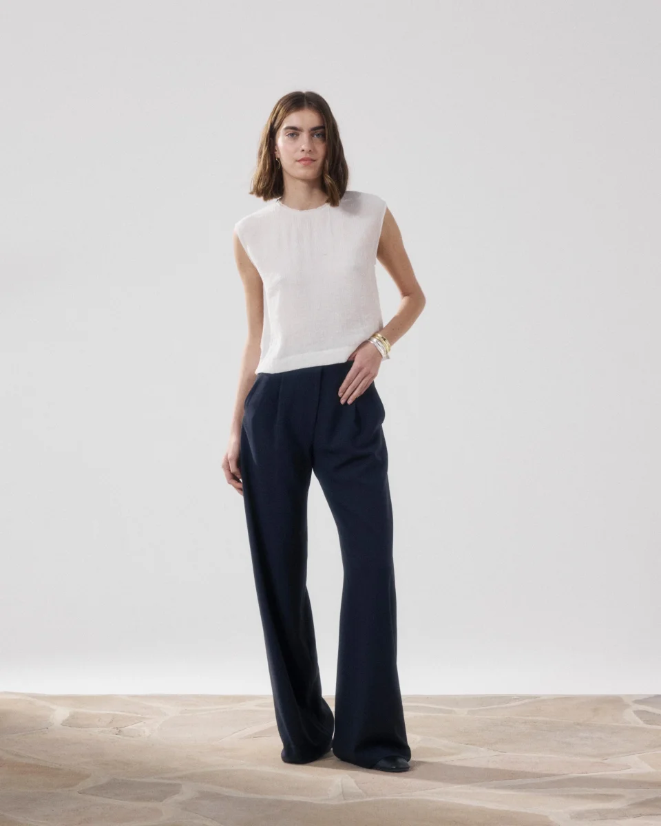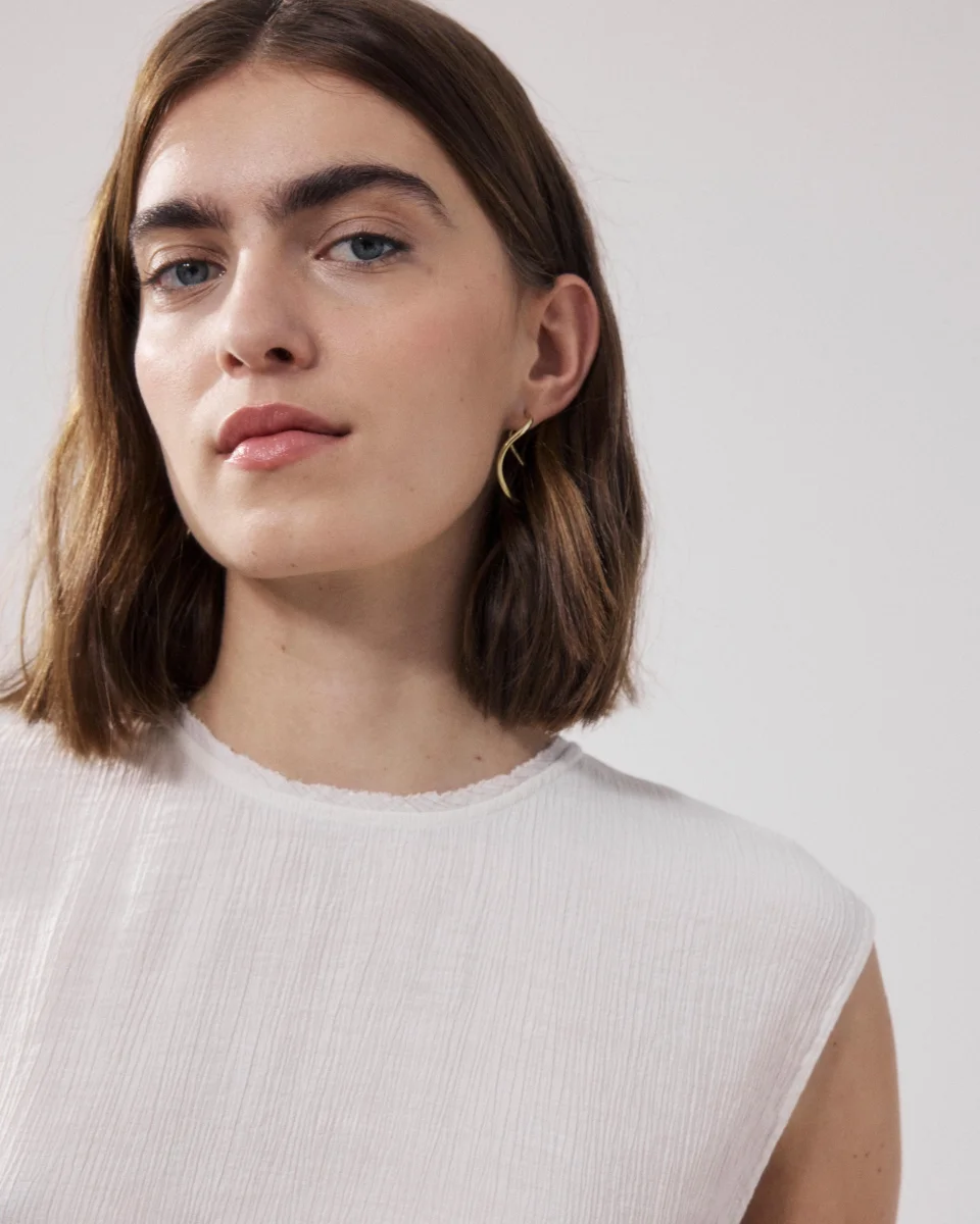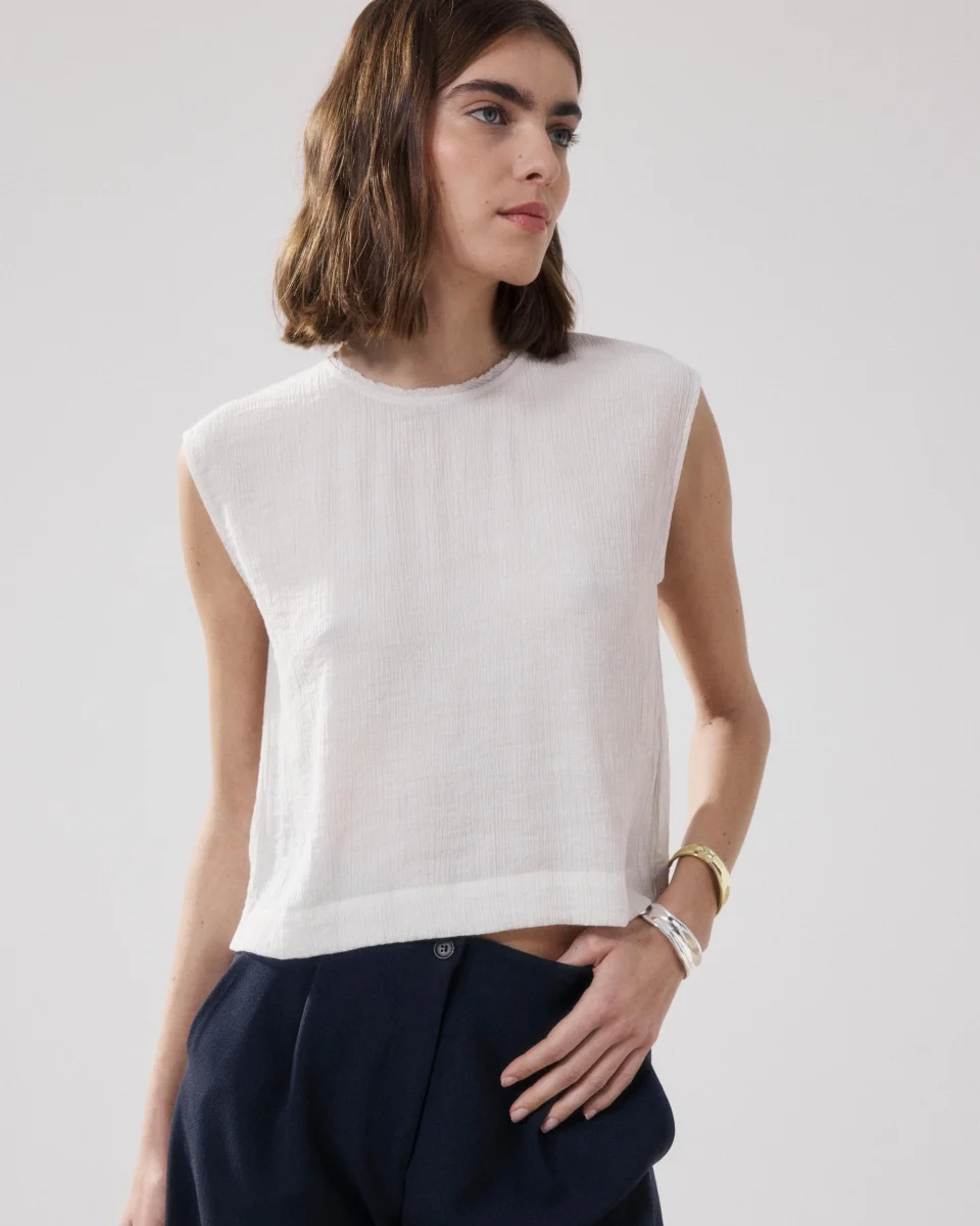 Top femme à col rond avec détail sans manches. Fermeture goutte boutonnée au dos. Deux petites fentes latérales.