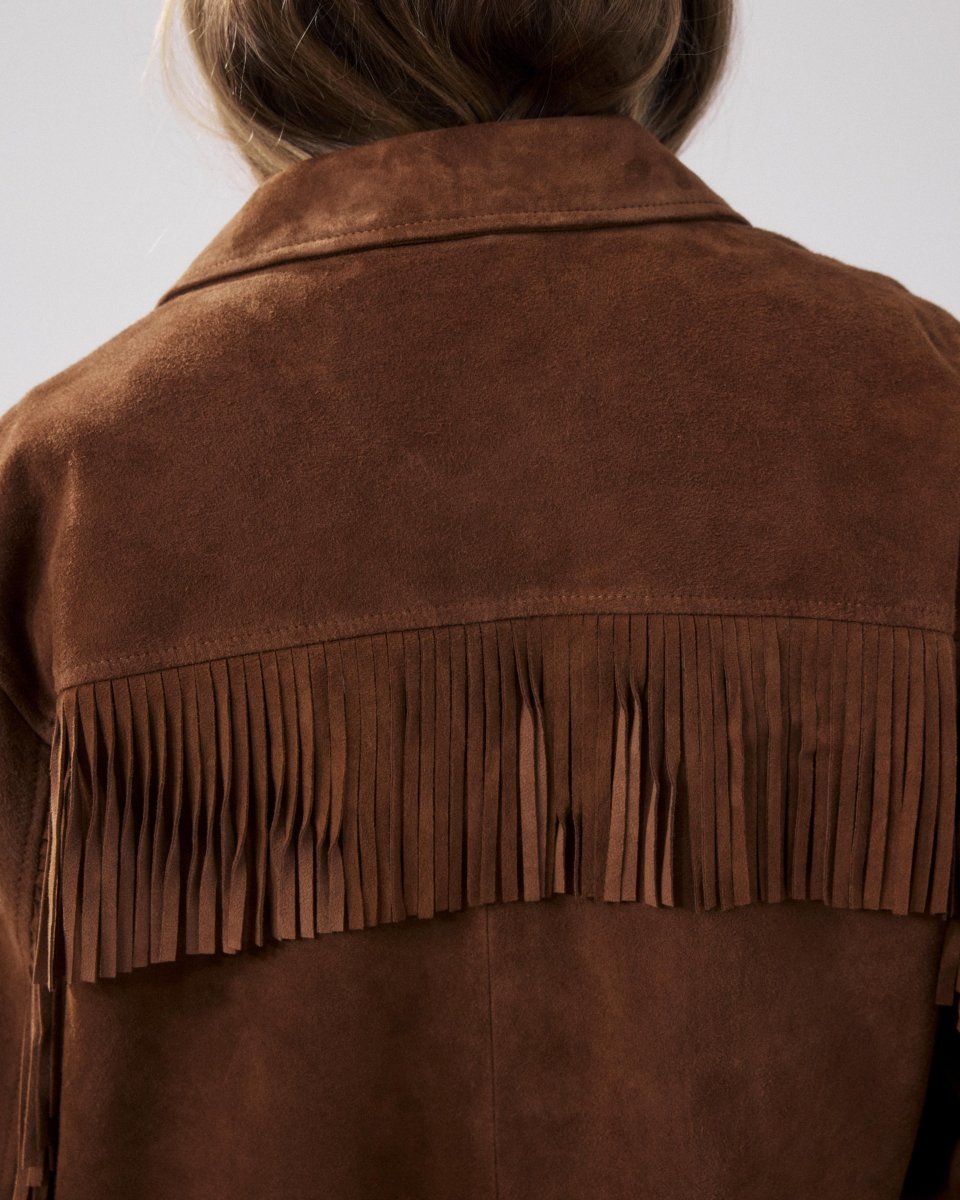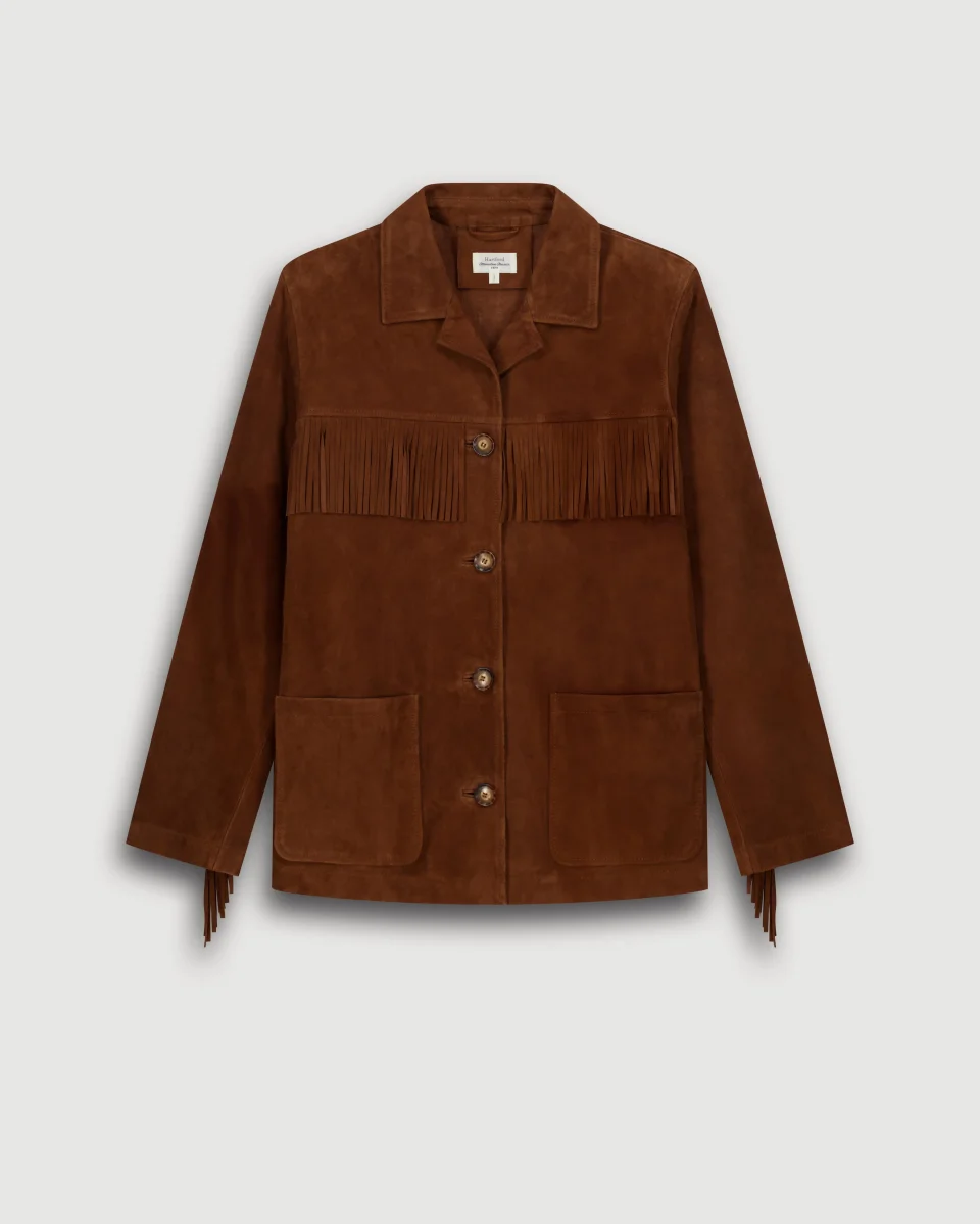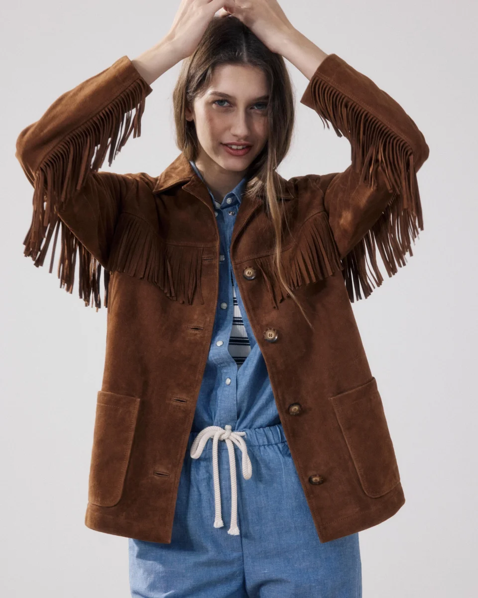 Veste femme à franges. Patte de boutonnage apparente. Deux poches plaquées.