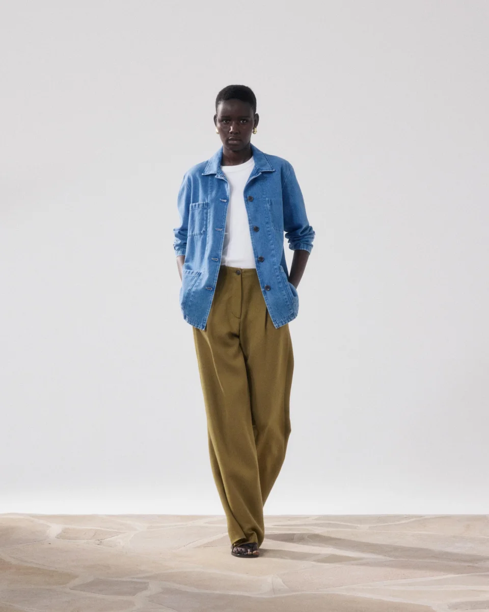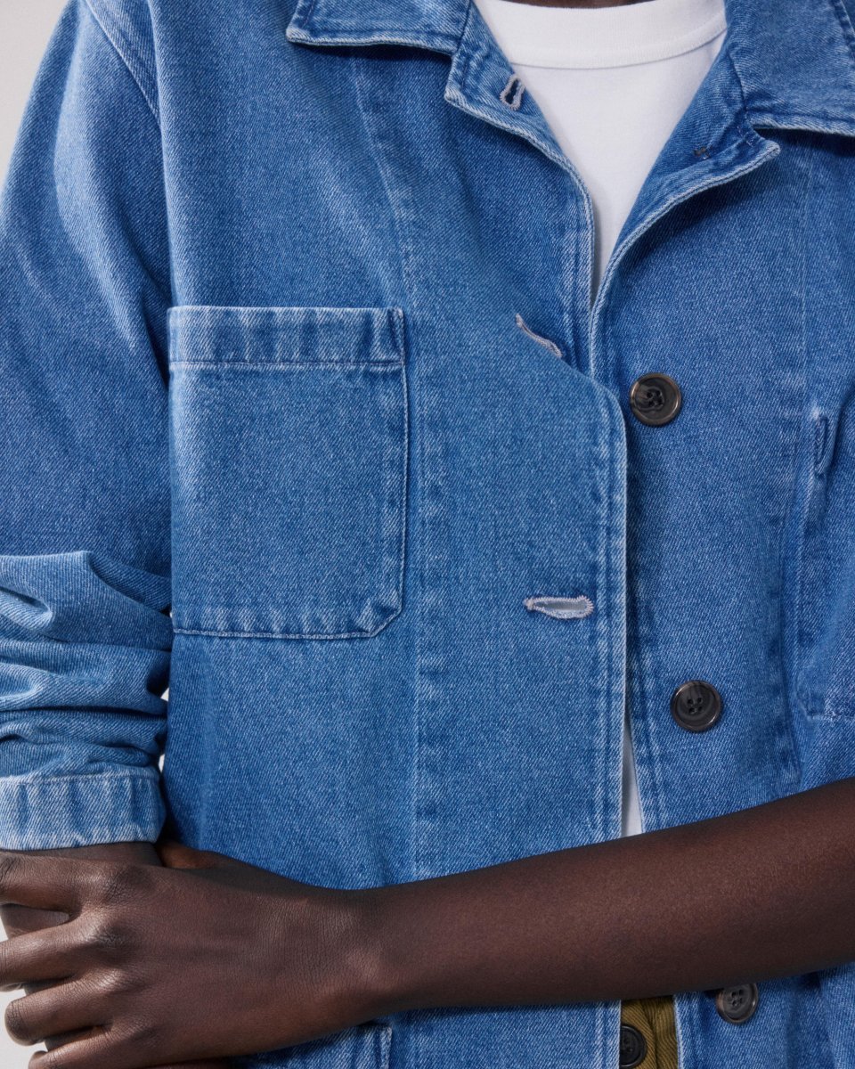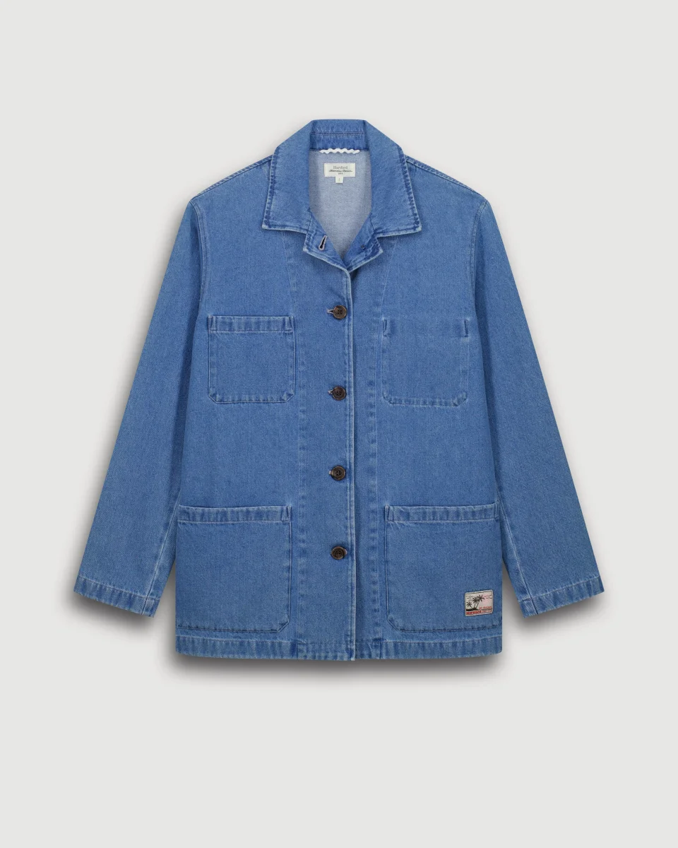 Veste femme d’inspiration workwear. Col chemise avec patte de boutonnage apparente à cinq boutons. Une poche plaquée poitrine extérieure et une poche poitrine plaquée intérieure. Deux poches plaquées devant.