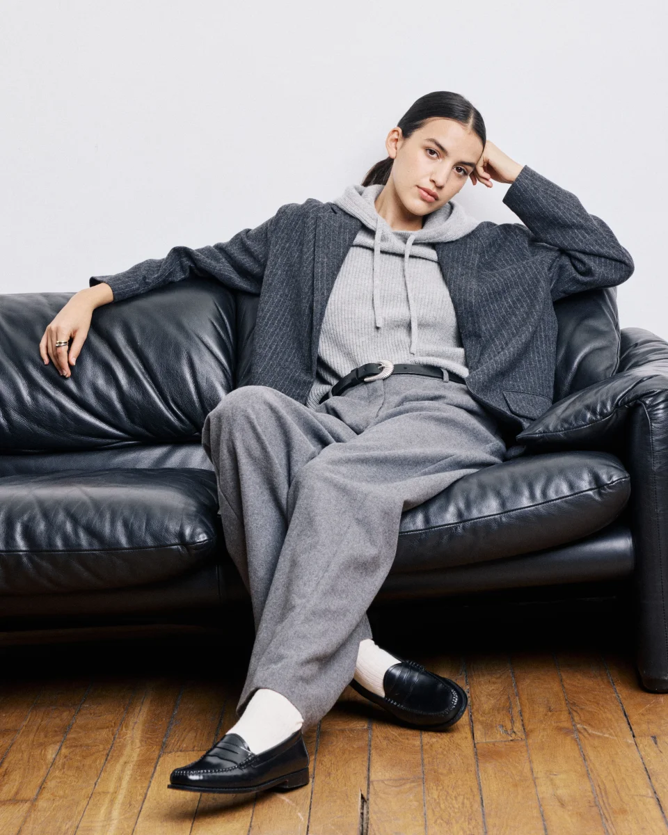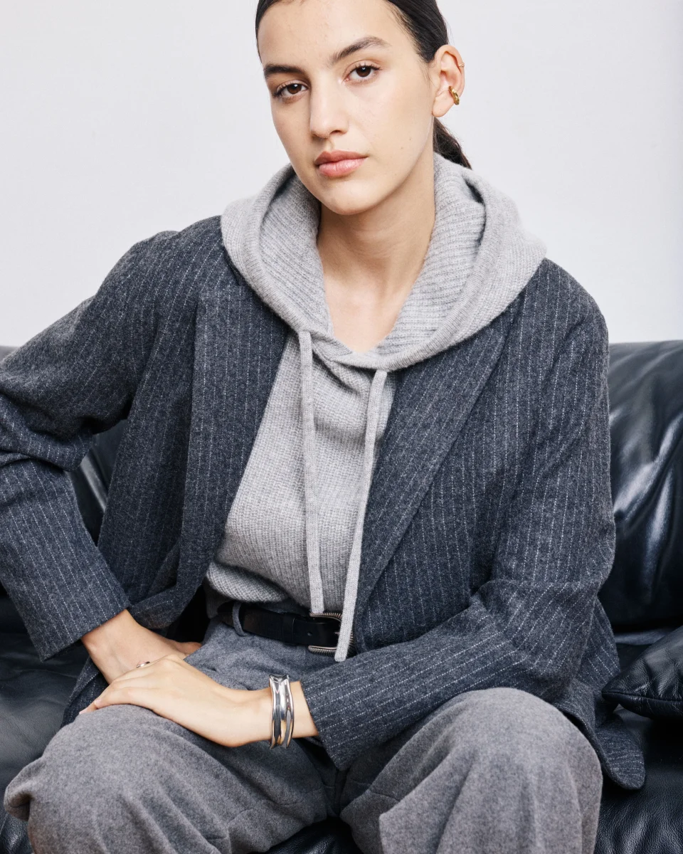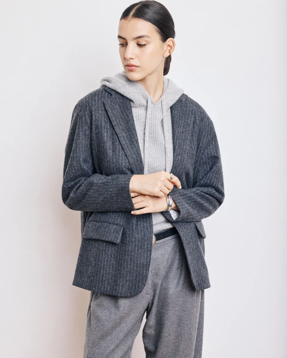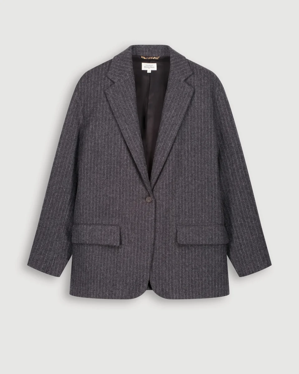 Veste blazer femme ample à col tailleur en flanelle de laine à rayures tennis. Boutonnage simple à un bouton. Deux poches à rabat et fente d’aisance dans le dos. Doublure intérieure noire pour le corps et manches doublées à rayures.