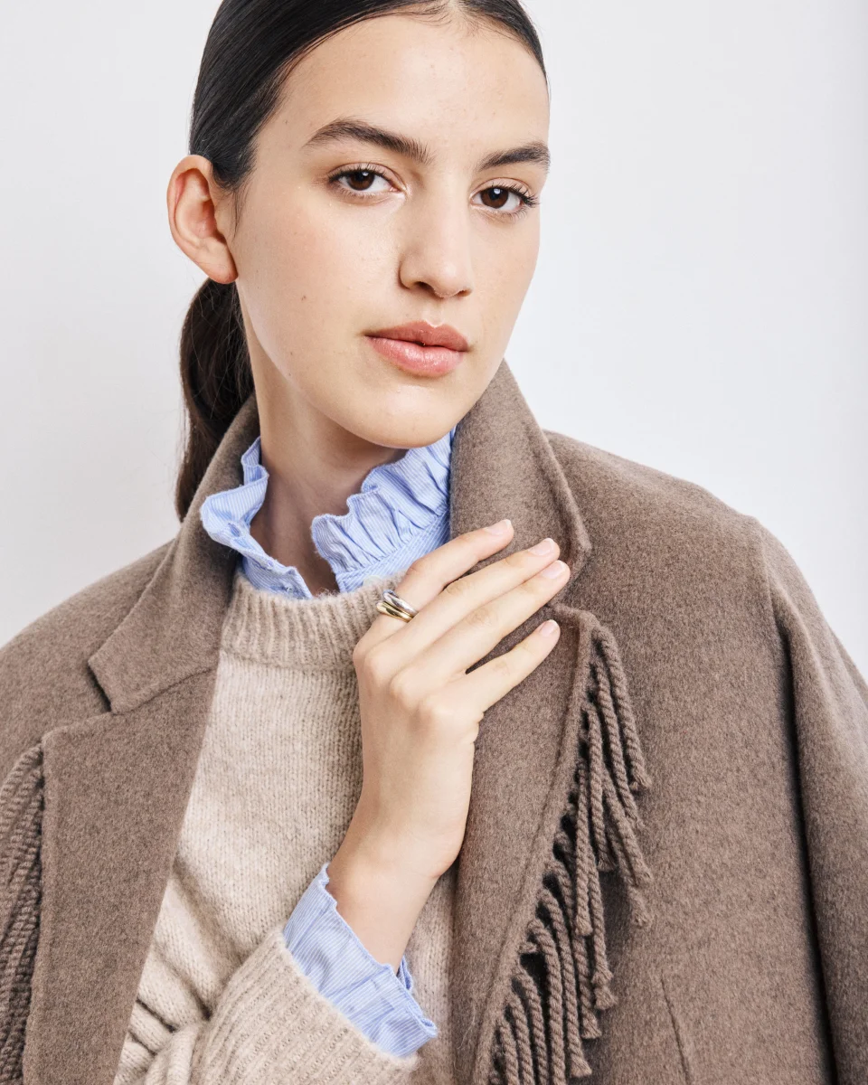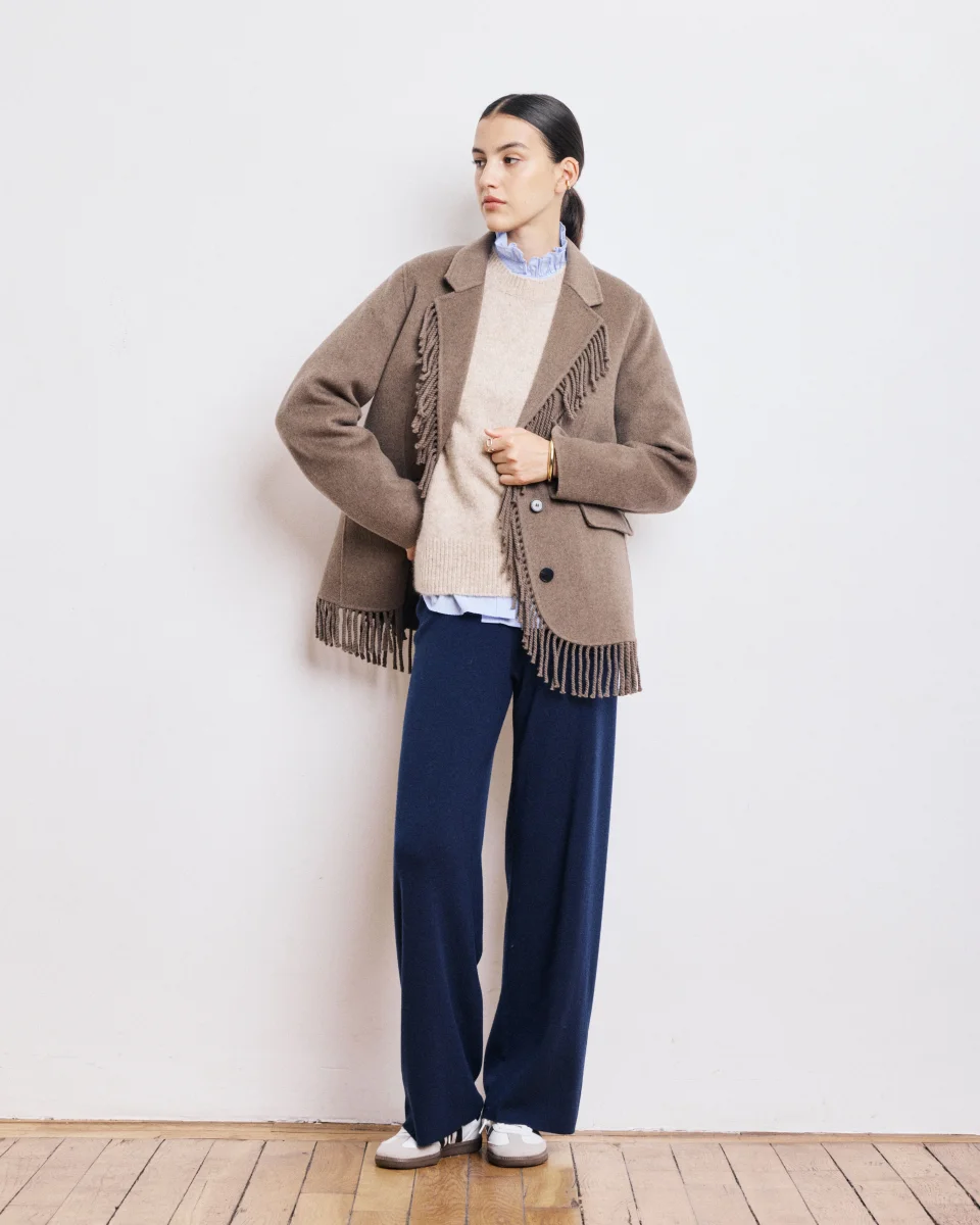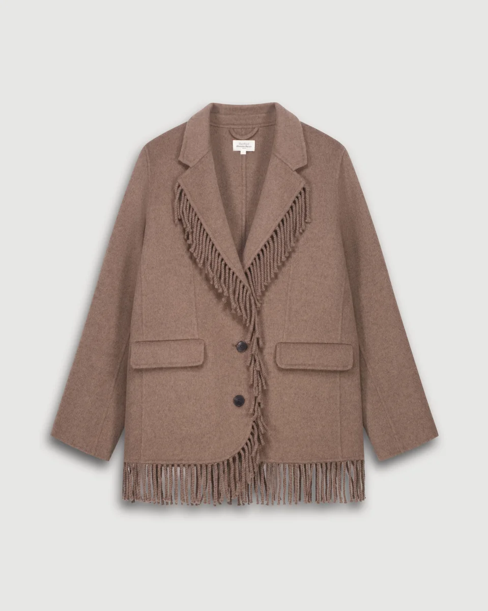 Veste d’inspiration blazer en laine double face avec franges. Fermeture trois boutons. Deux poches à rabat.