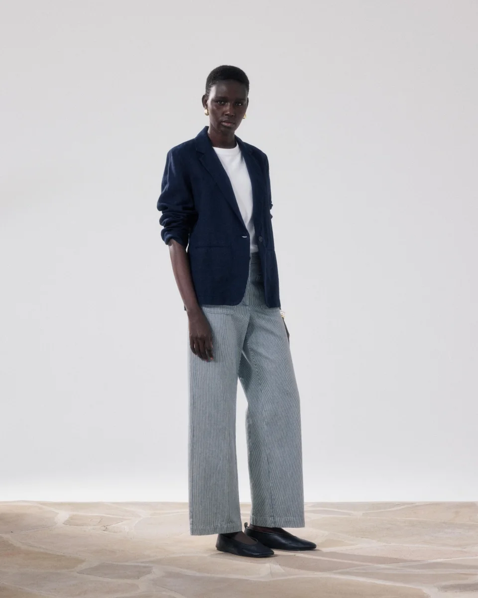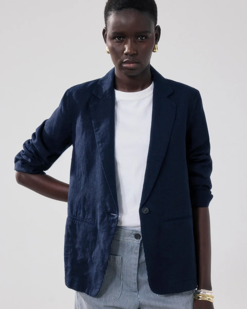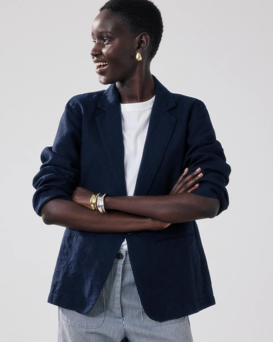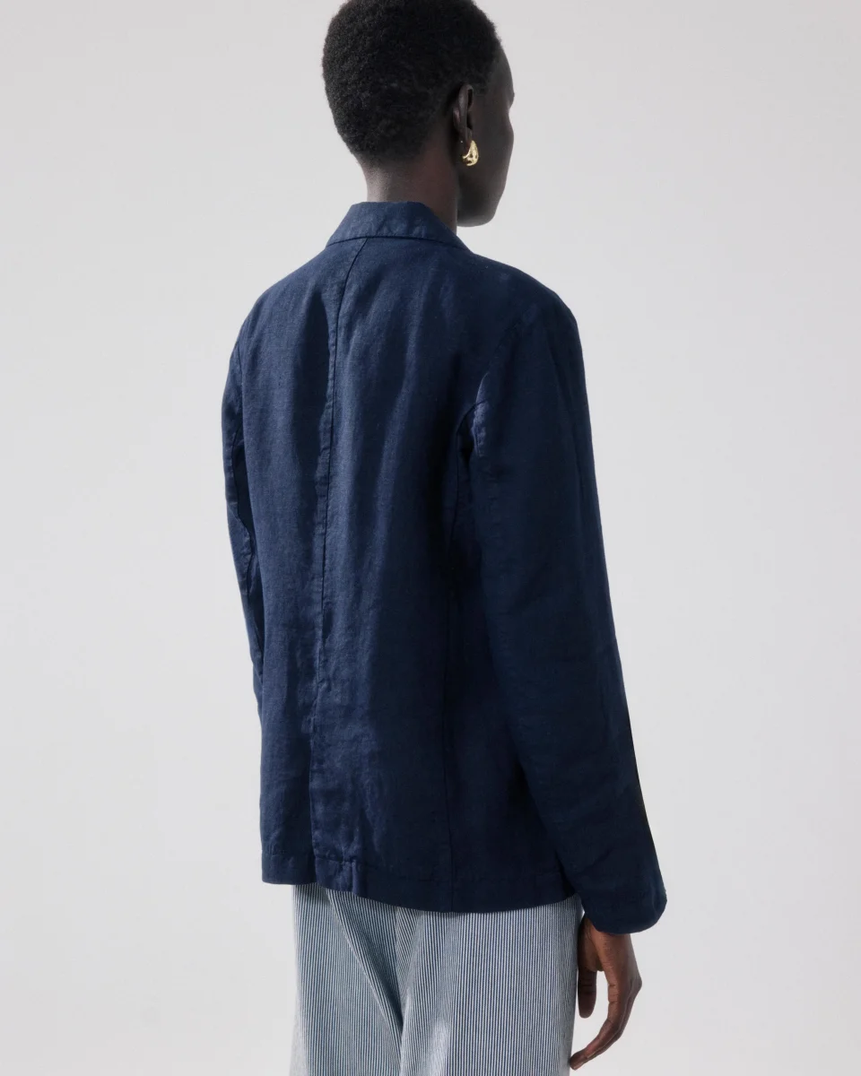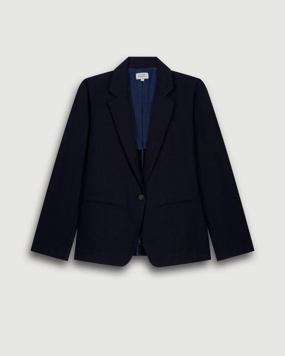 Veste blazer femme à col tailleur. Coupe ajustée, boutonnage simple avec un bouton. Deux poches passepoilées devant et fente d’aisance dans le dos.