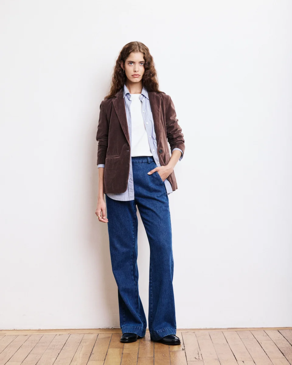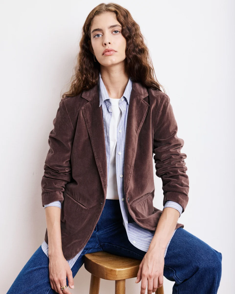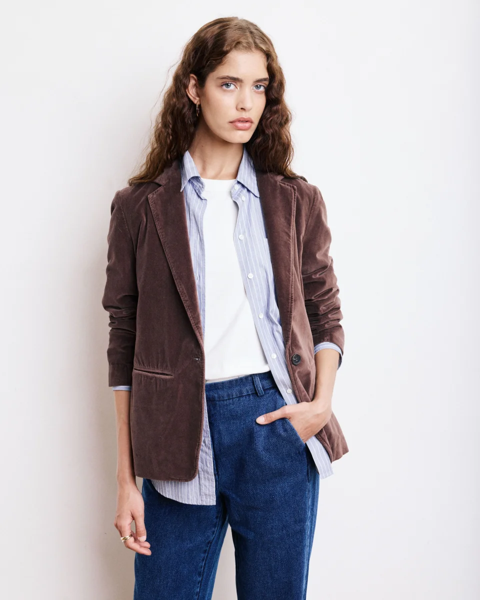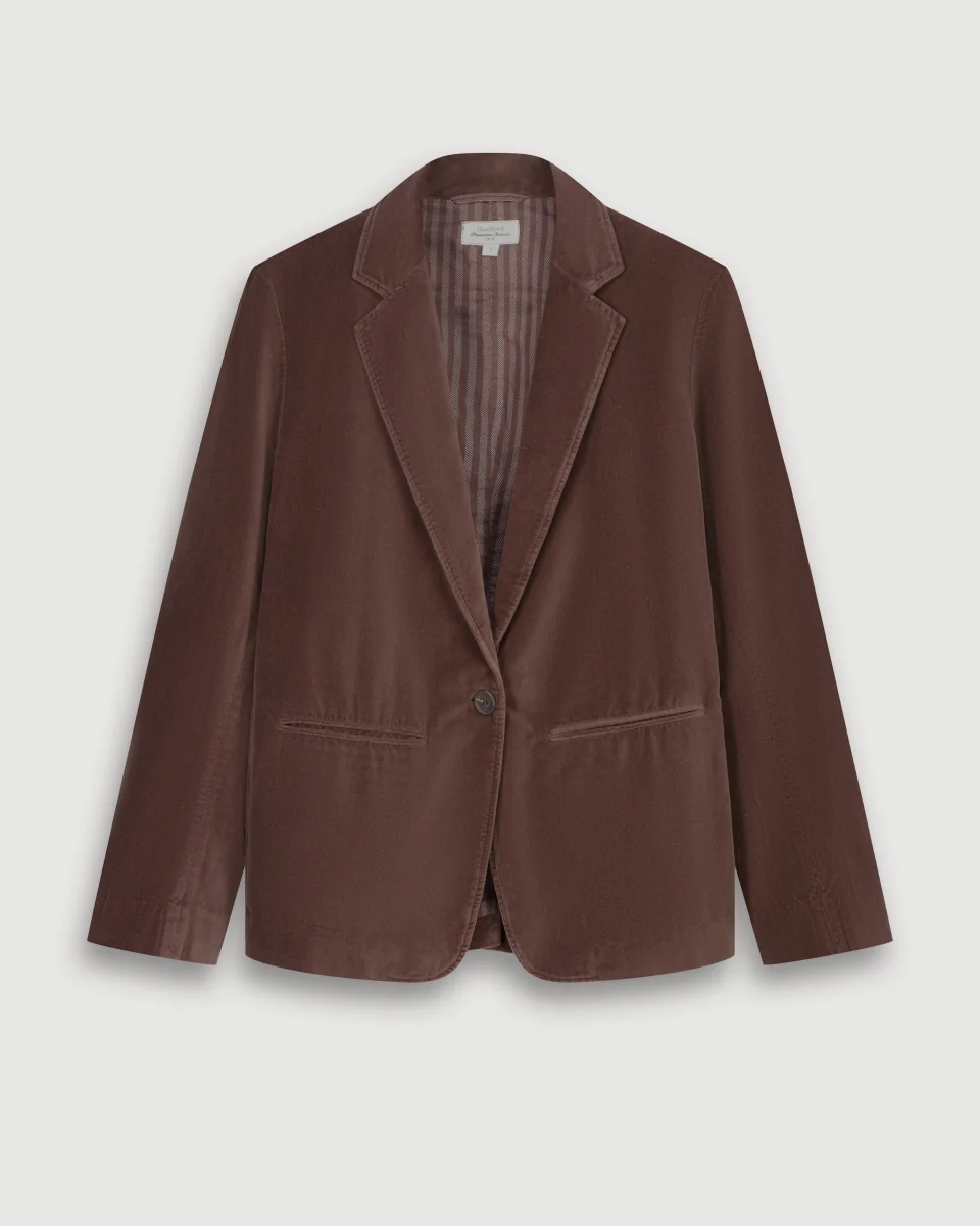 Veste blazer femme à col tailleur en velours lisse. Coupe ajustée, boutonnage simple avec un bouton et doublure imprimée à rayures. Deux poches passepoilées devant et fente d’aisance dans le dos.