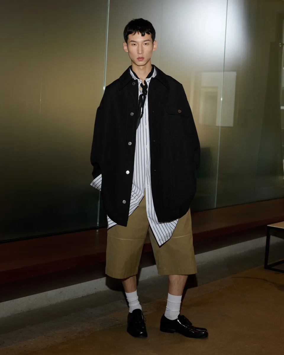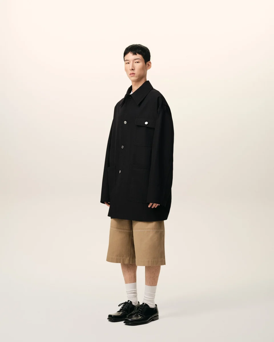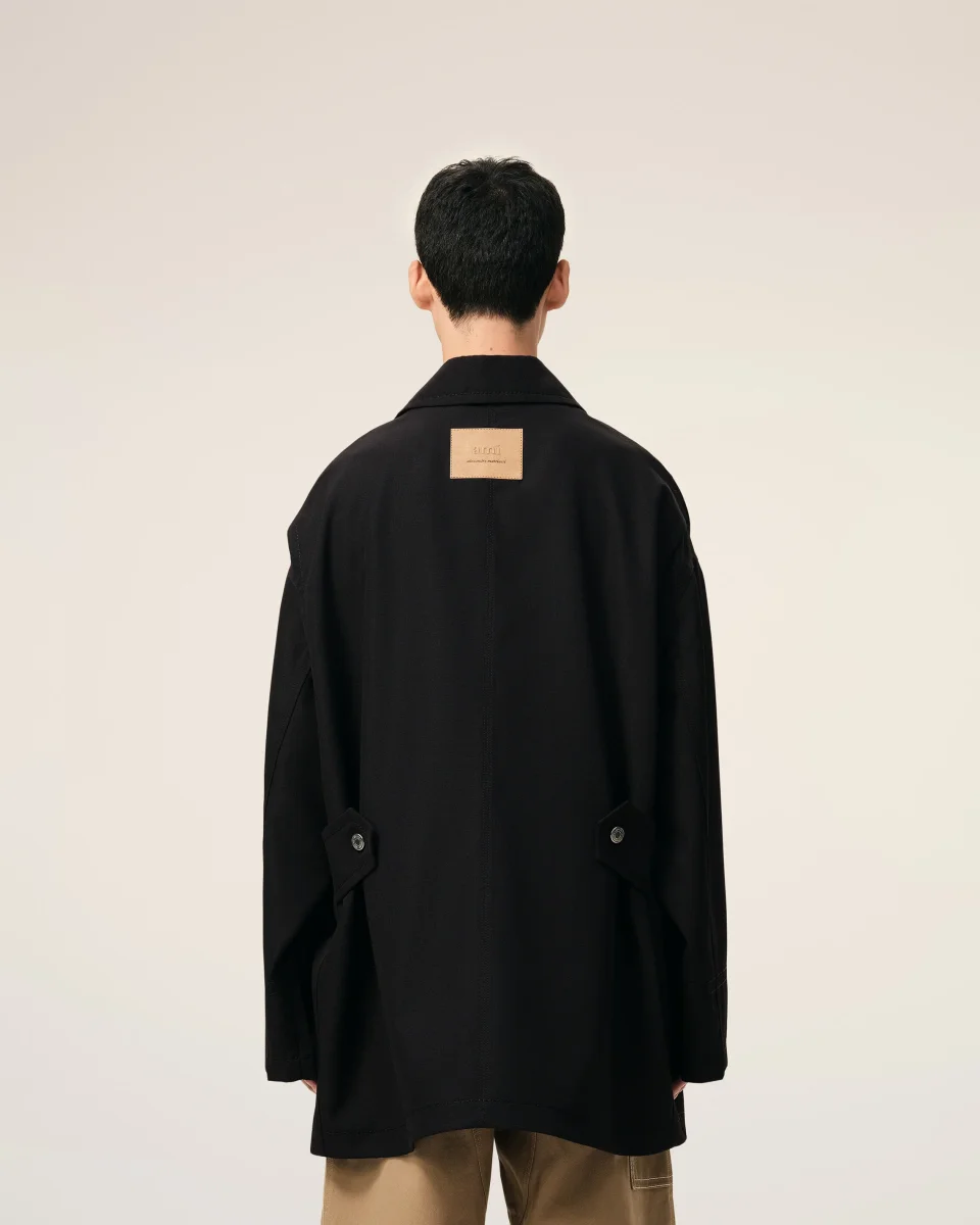 Veste worker en toile de laine. Produit unisexe Coupe oversize Col classique Fermeture devant avec boutons denim coloris nickel Pattes de resserrage au dos Poches plaquées sur le devant Poche intérieure avec bouton corne Jacron papier « ami alexandre mattiussi » au dos Surpiqûres ton sur ton Fabriqué en Roumanie (avec amour) REF: UJK880.WV0195.001